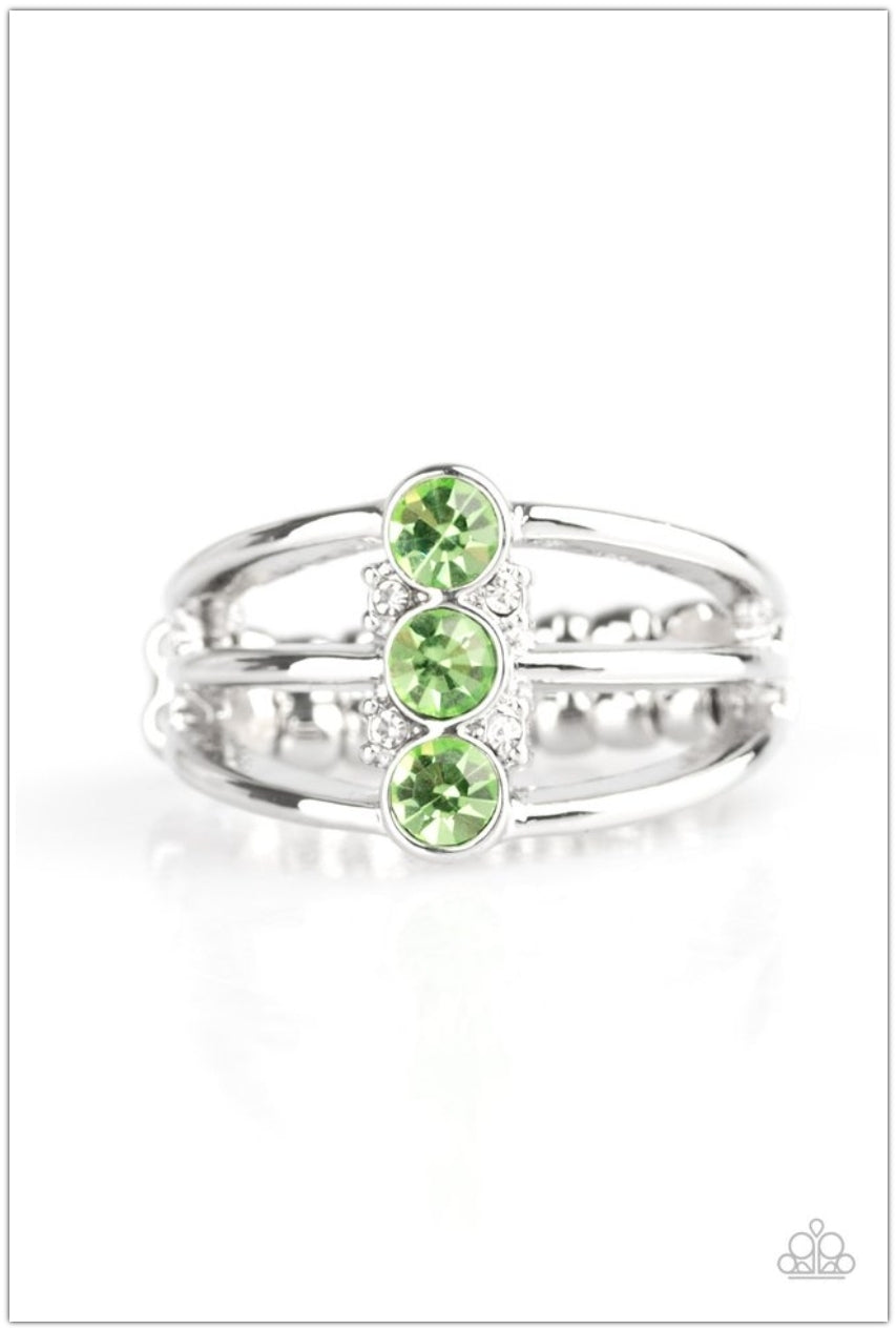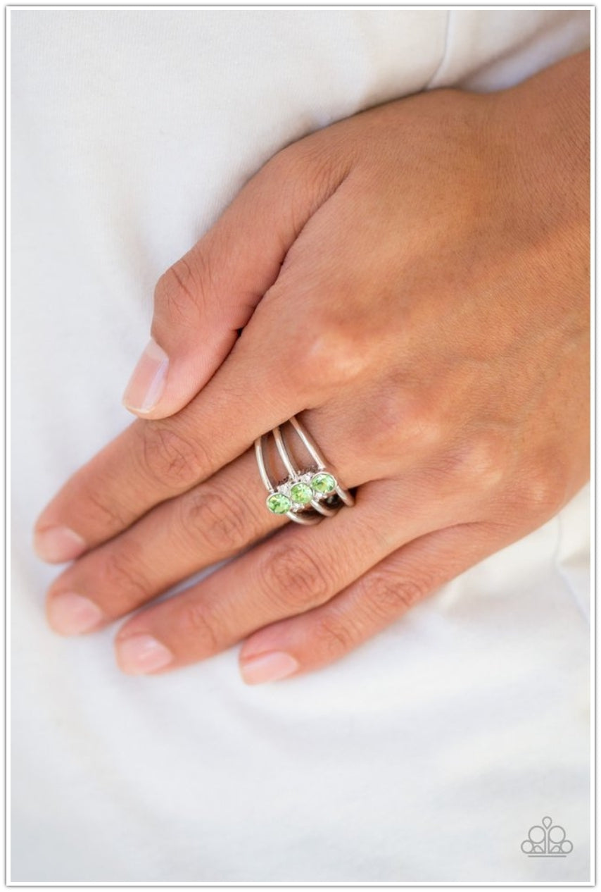 Glistening silver bands arc across the finger, coalescing into an airy frame. Infused with dainty white rhinestones, three green rhinestones are encrusted down the center of the bands for a refined finish. Features a dainty stretchy band for a flexible fit.