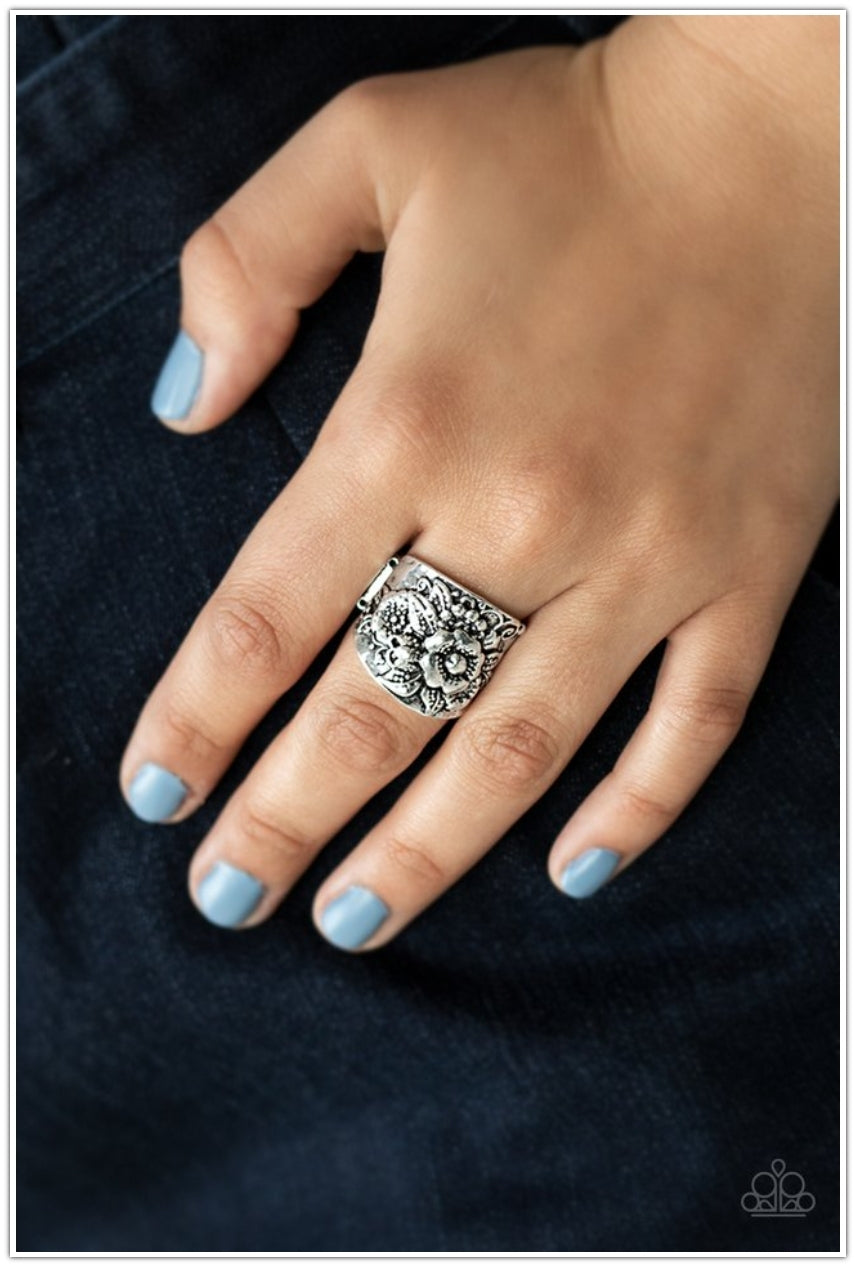 Brushed in an antiqued shimmer, a thick silver band is studded and embossed in a blooming bouquet of tropical flowers for a seasonal flair. Features a stretchy band for a flexible fit.