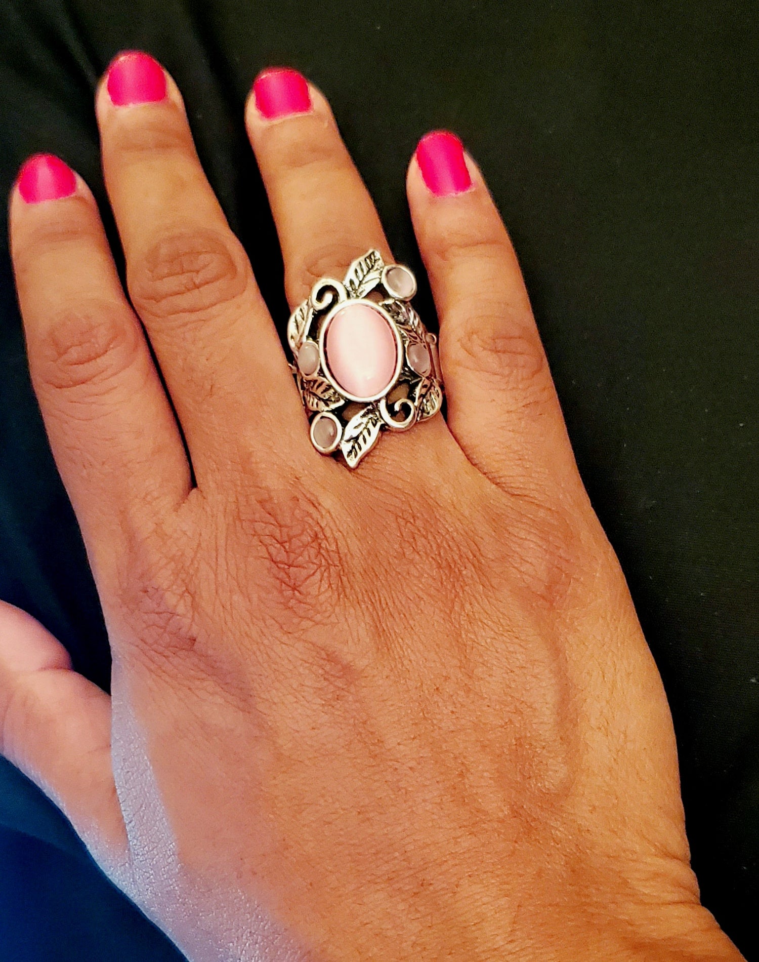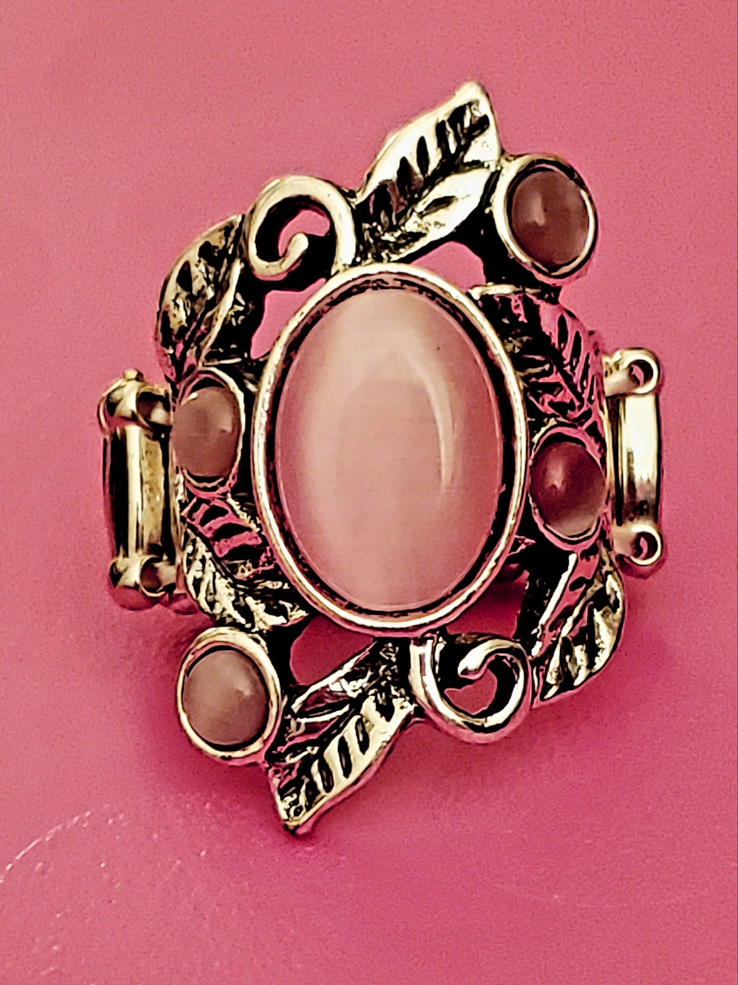 Featuring a pink moonstone center also four smaller pink moonstones surrounded by silver leaves. Features a stretchy band for a flexible fit.