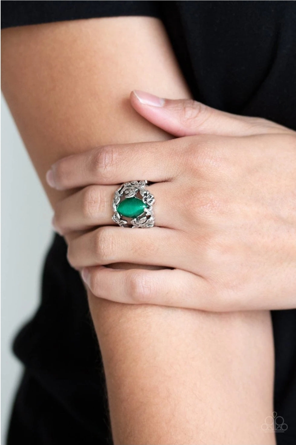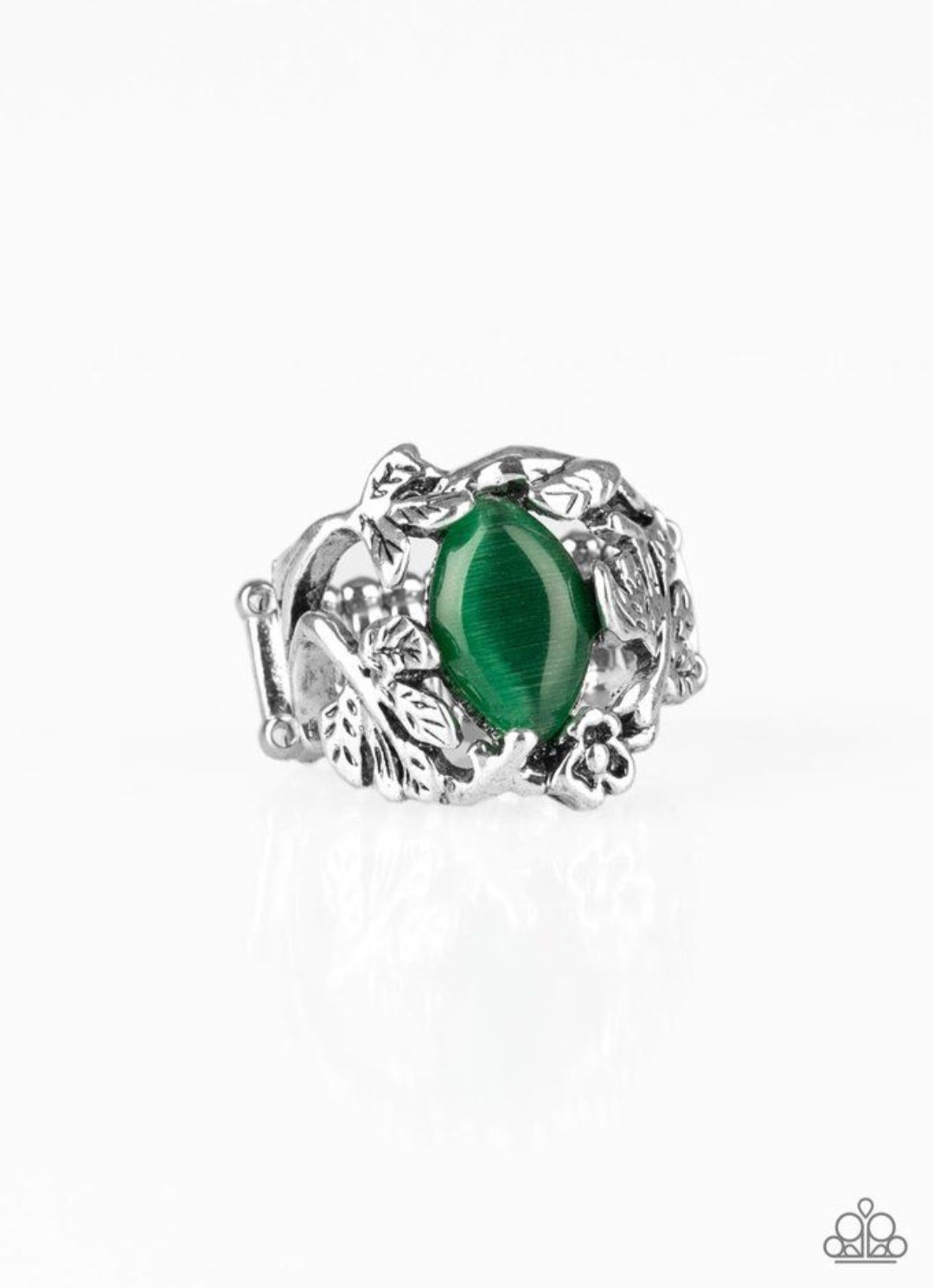 A leafy silver band curls around a glowing green moonstone, creating a whimsical centerpiece. Features a stretchy band for a flexible fit.