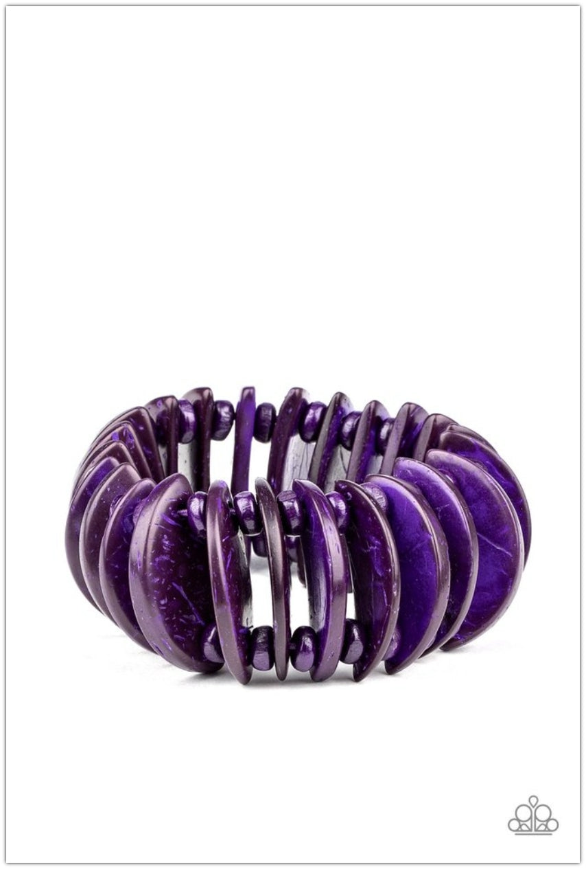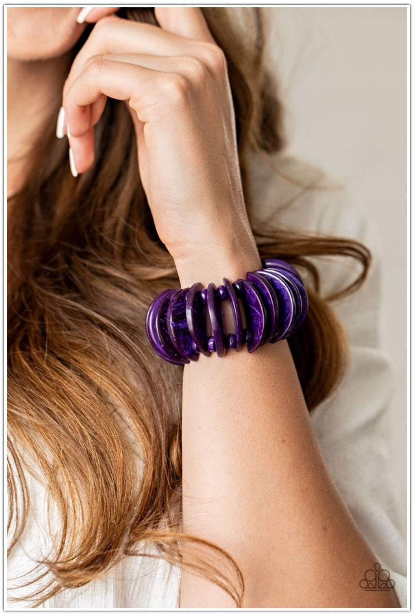 Infused with purple wooden beads, distressed purple wooden crescents are threaded along stretchy bands around the wrist for a summery look.
