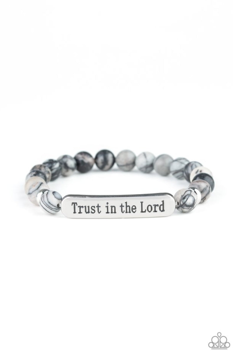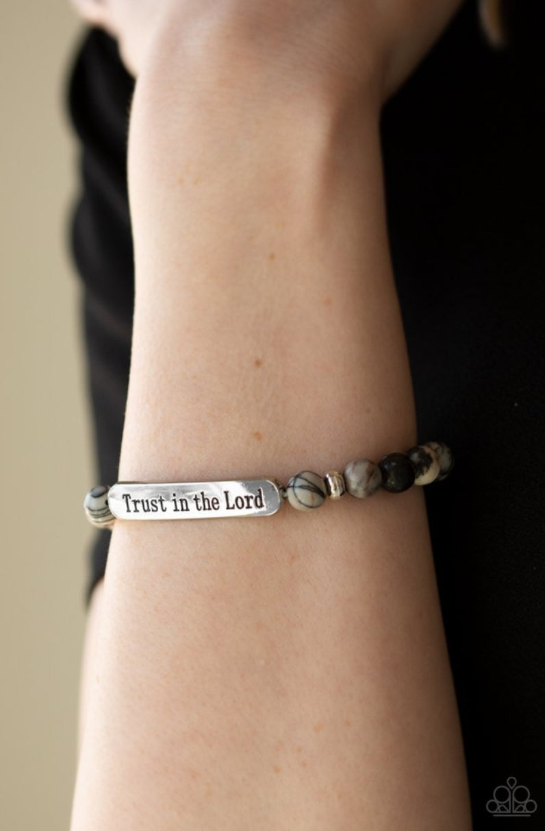 Infused with dainty silver accents, a collection of natural stone beads and a shimmery silver frame stamped in the phrase, "Trust in the Lord", are threaded along a stretchy band around the wrist for an inspirational look.