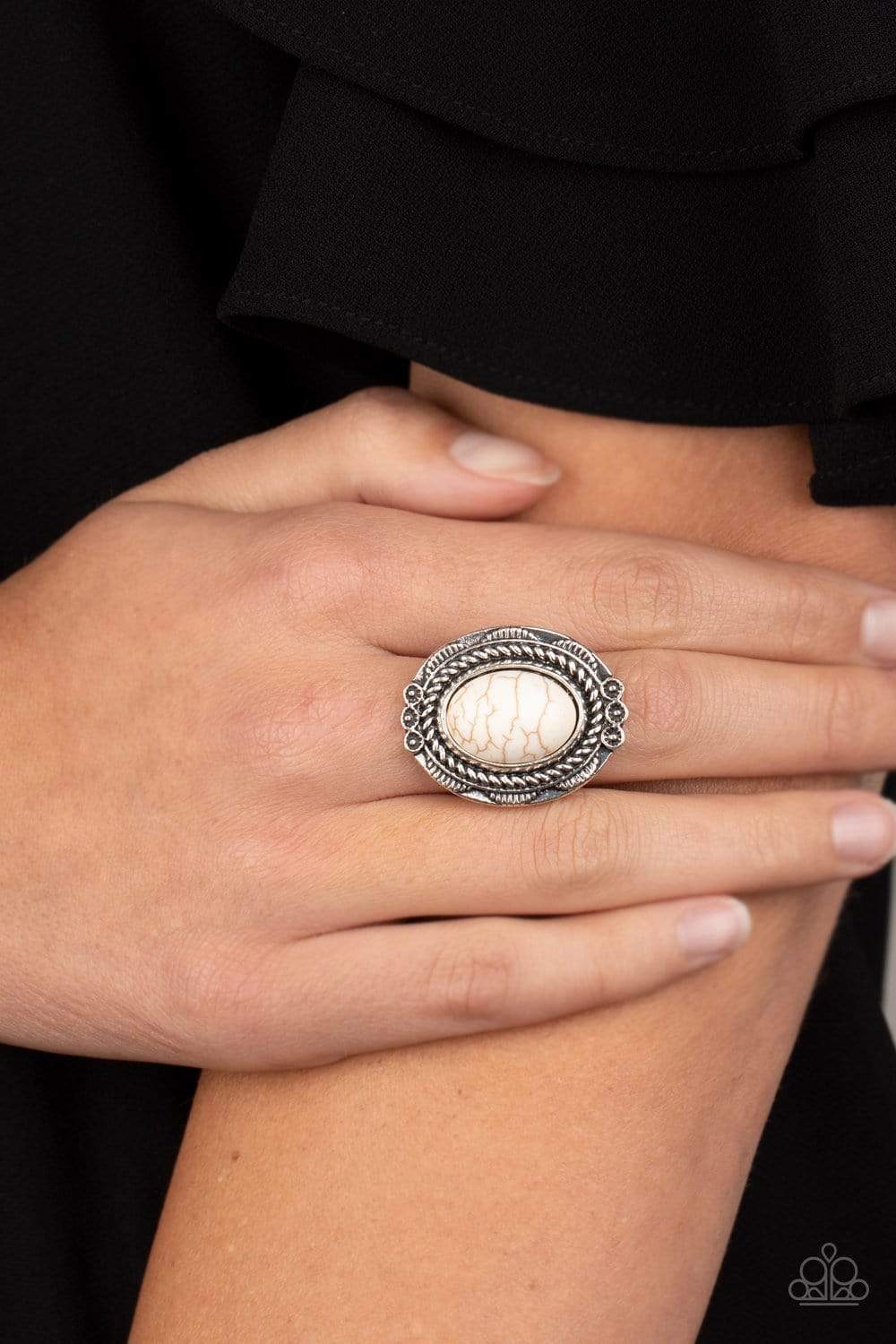A refreshing white stone is pressed into an antiqued silver frame radiating with floral detail for a seasonal look. Features a stretchy band for a flexible fit.