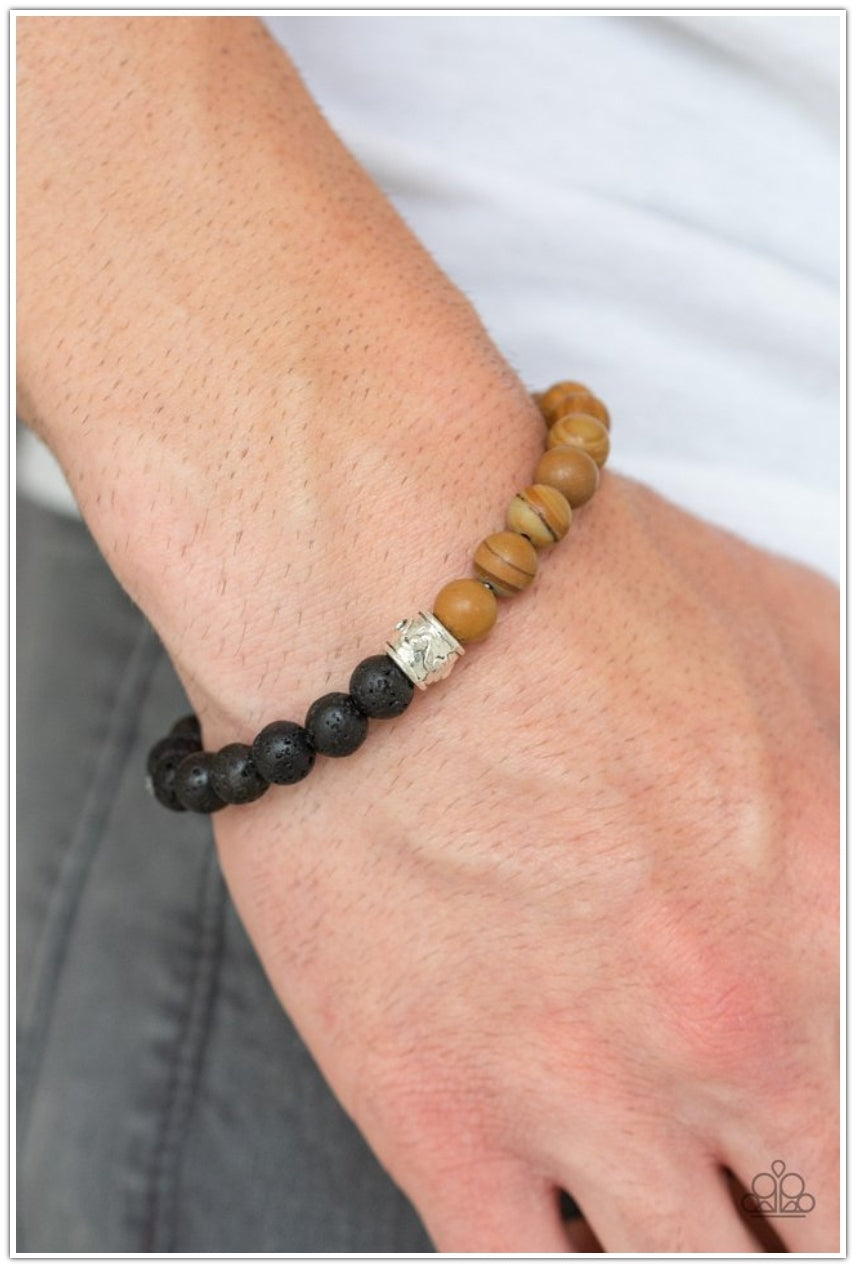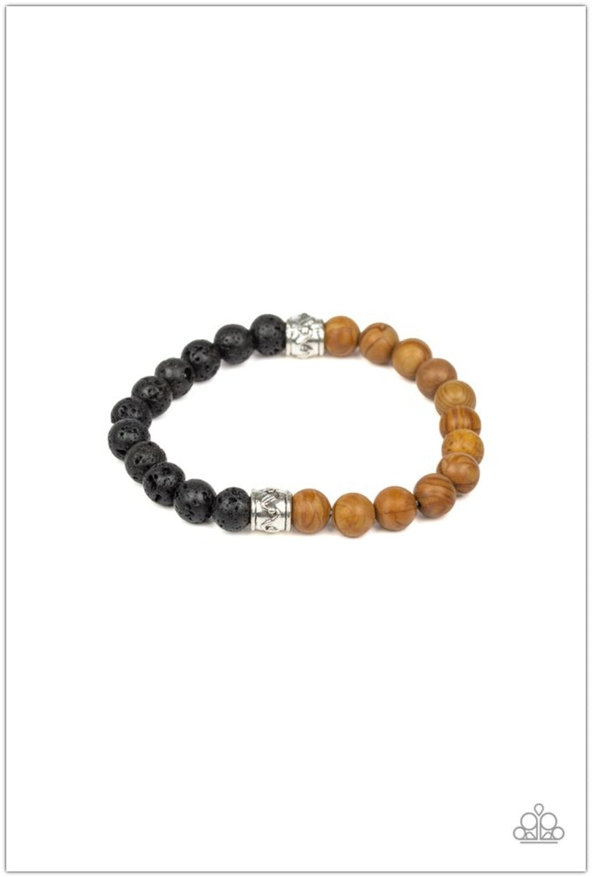 A collection of black lava rock beads, brown stone beads, and ornate silver accents are threaded along a stretchy band around the wrist for a seasonal look.