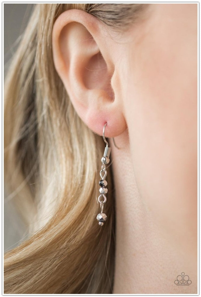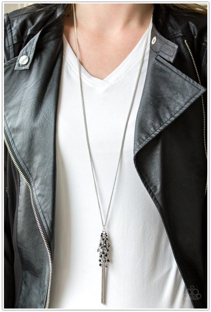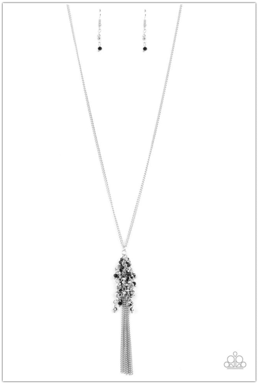 Twinkling metallic and black beads are threaded along dainty silver rods, creating a sparkling fringe at the bottom of a lengthened silver chain. A shimmery silver tassel extends from the bottom for an edgy finish.