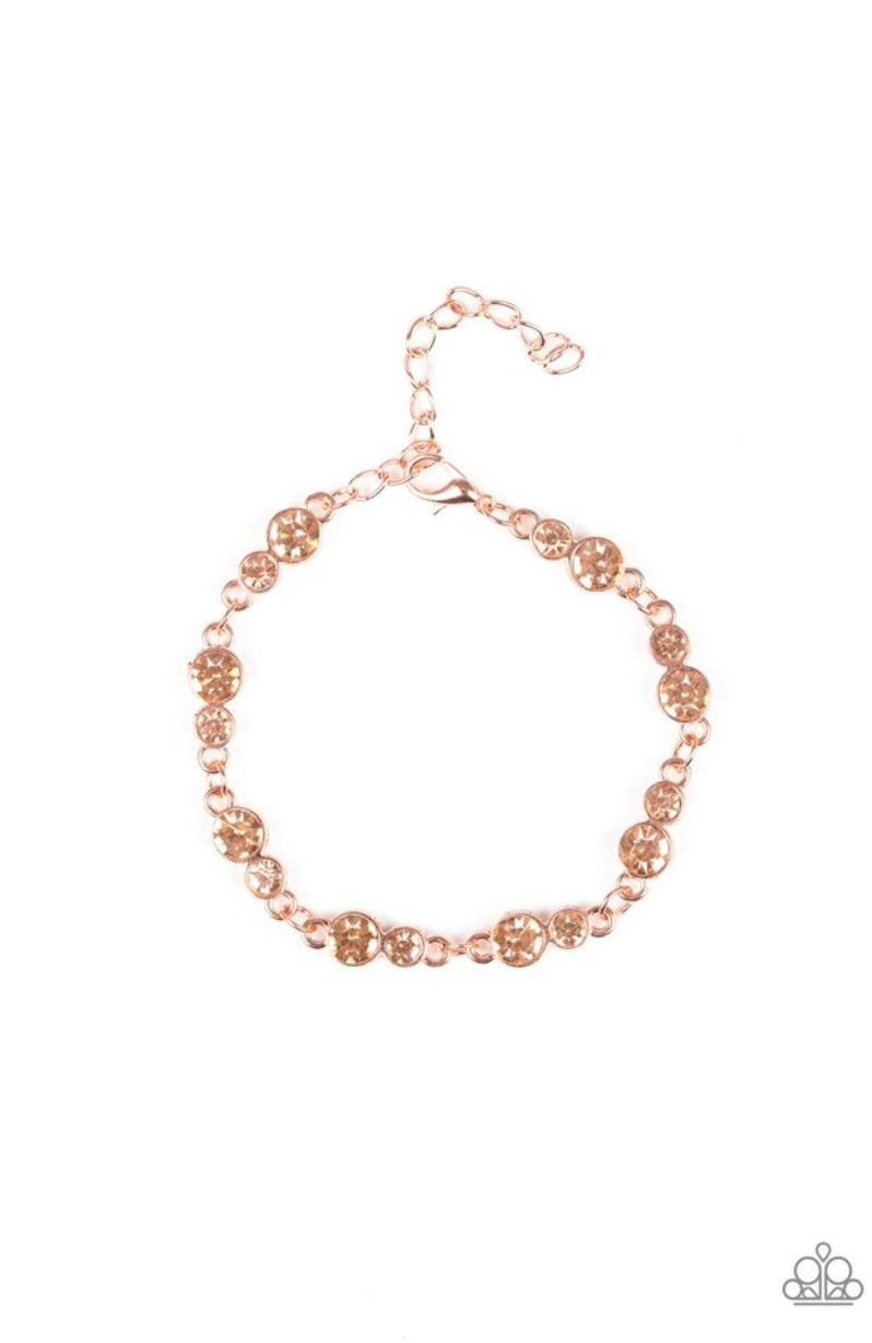 Varying in size, pairs of glassy peach rhinestones are encrusted along shiny copper frames and linked around the wrist for a timeless finish. Features an adjustable clasp closure.