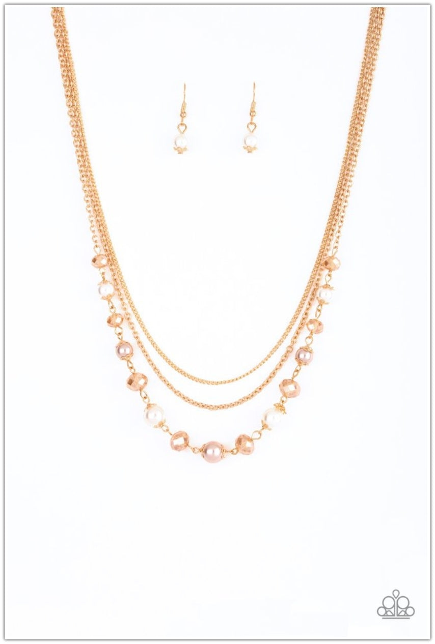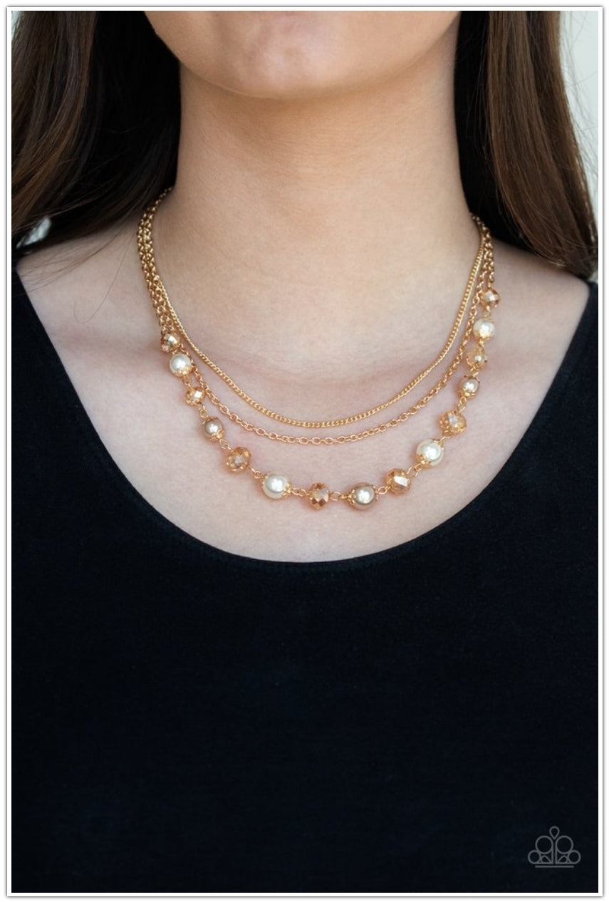 Infused with two layers of dainty gold chains, pearly white and sparkling crystal-like beads link below the collar for a demure look. Features an adjustable clasp closure.