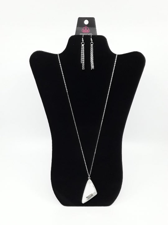 Cut into a striking triangular shape, a faceted white gem swings from the bottom of a lengthened silver chain for an edgy-glamorous fashion. Features an adjustable clasp closure.