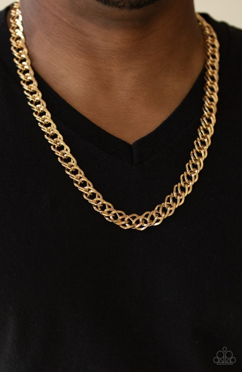 Featuring doubled links, a glistening gold chain drapes across the chest for a bold look. Features an adjustable clasp closure.