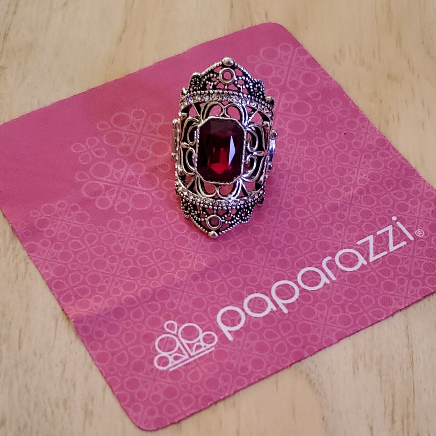Infused with two bands of glittery white rhinestones, smooth and studded silver filigree branches out into a regal backdrop across the finger. Featuring an emerald style cut, a glittery red rhinestone embellishes the center for a royal finish. Features a stretchy band for a flexible fit.