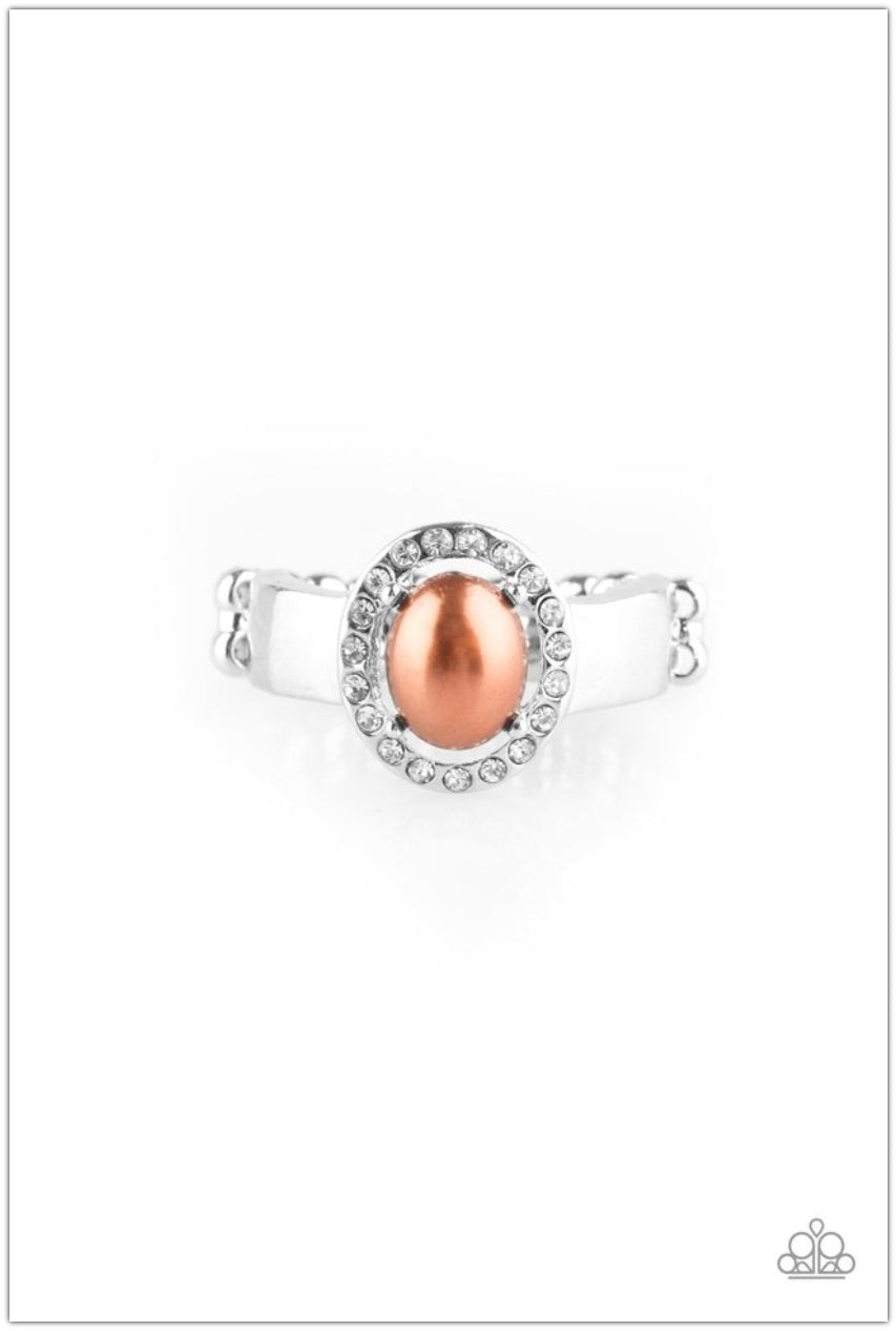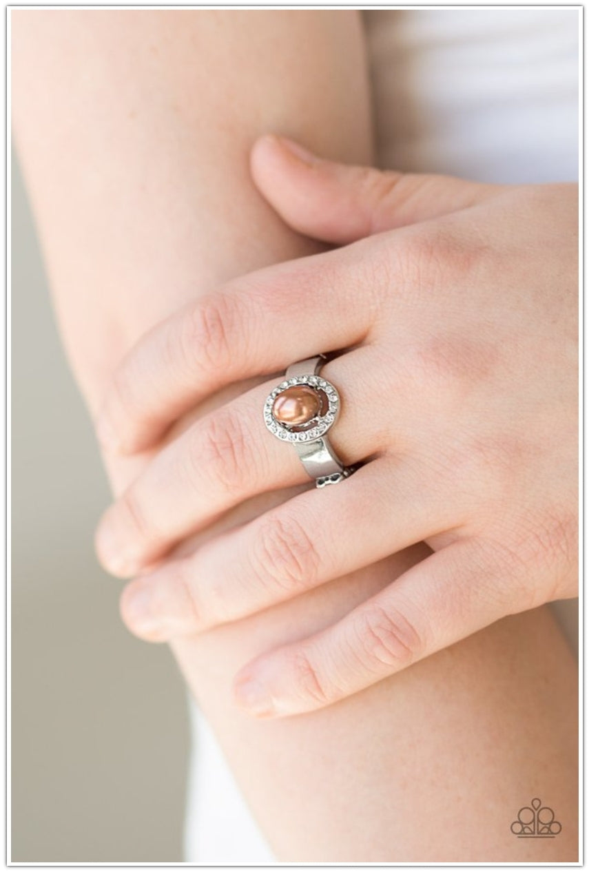 A pearly brown bead is pressed into a white rhinestone encrusted frame, creating the illusion of a floating centerpiece atop the finger. Features a dainty stretchy band for a flexible fit.