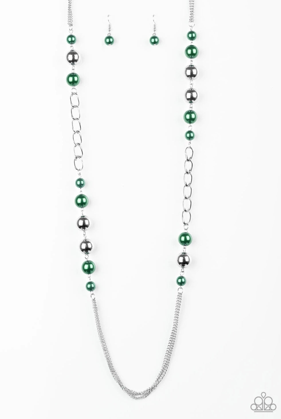 Varying in size, green and oversized silver beads give way to sections of bold silver chains for a flawless look.