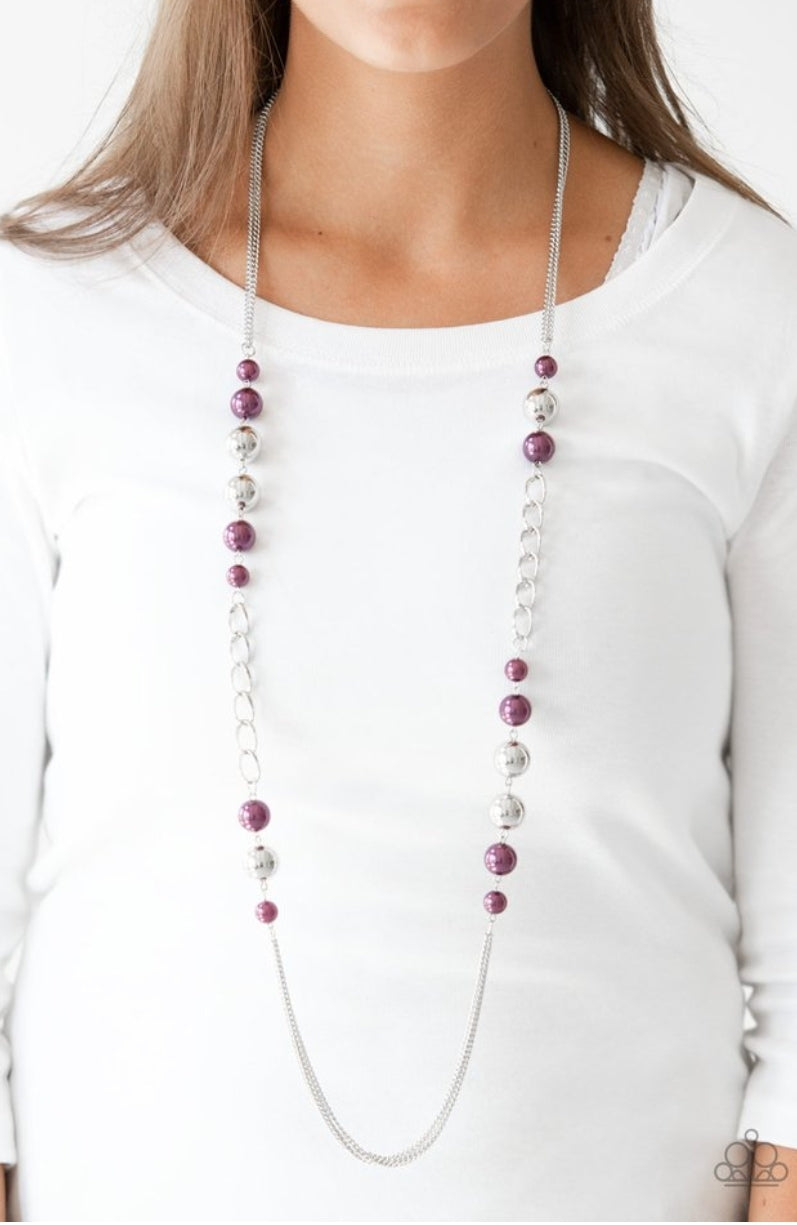 Varying in size, pearly purple and oversized silver beads give way to sections of bold silver chain. Layers of silver chains drape across the bottom of the design for a flawless finish. Features an adjustable clasp closure.
