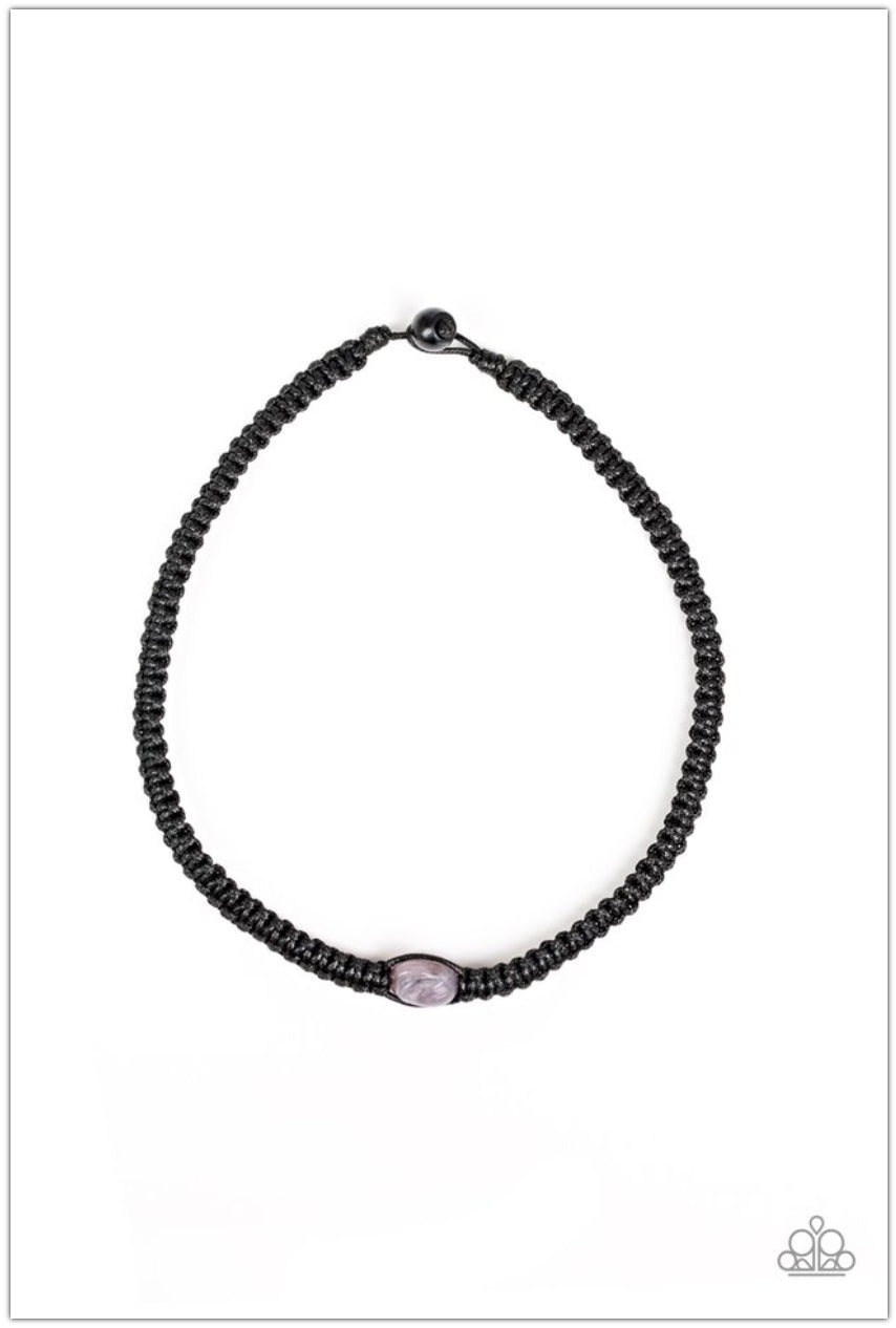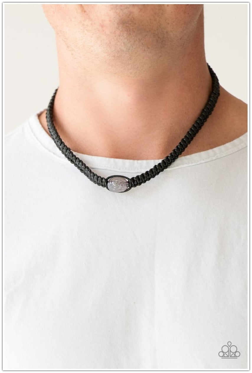 Braided black cording knots around a cloudy bead, creating an edgy pendant. Features a button loop closure.