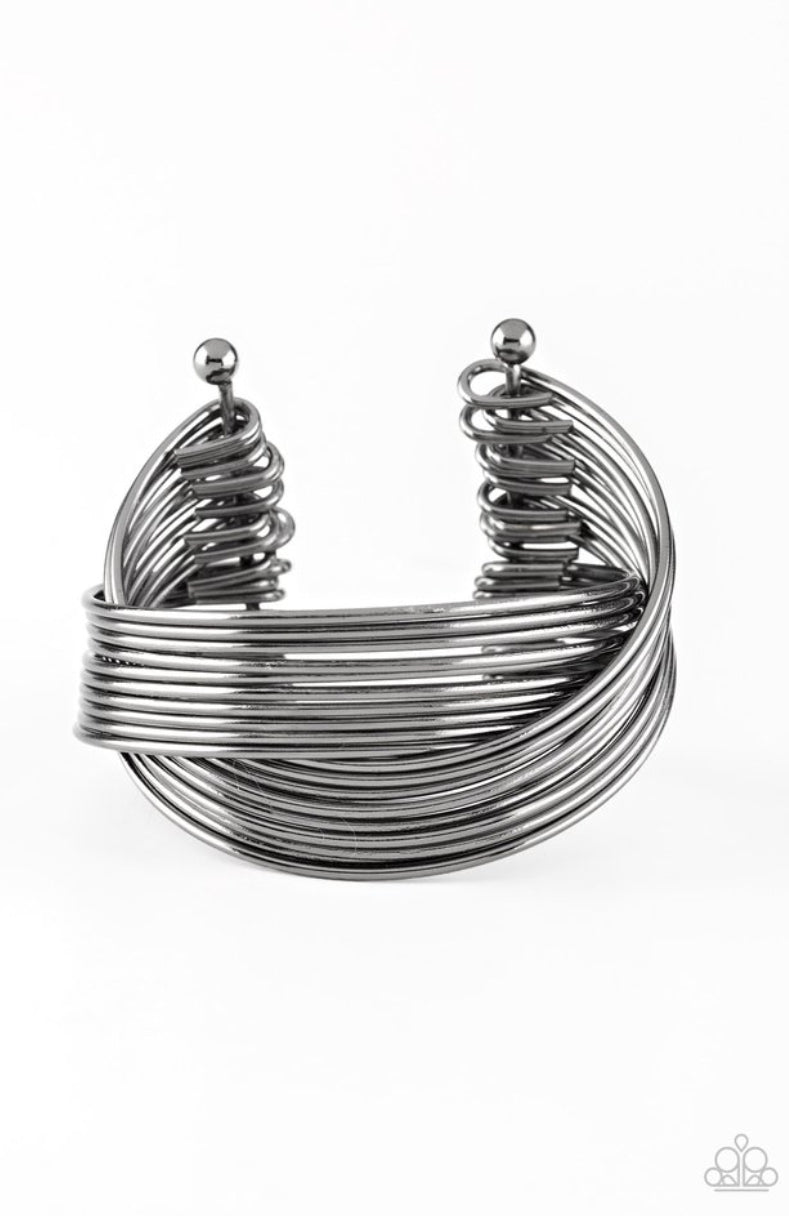 Threaded along two metallic rods, glistening gunmetal bars crisscross across the wrist, coalescing into a layered cuff.
