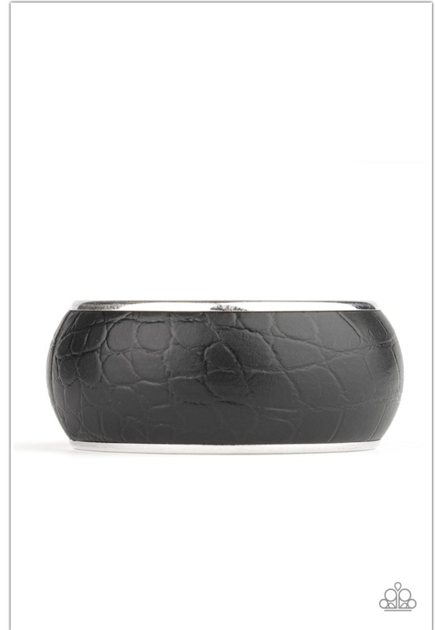 Featuring a subtle crocodile print, a faux piece of black leather wraps around a dramatically oversized silver bangle for a bold look.