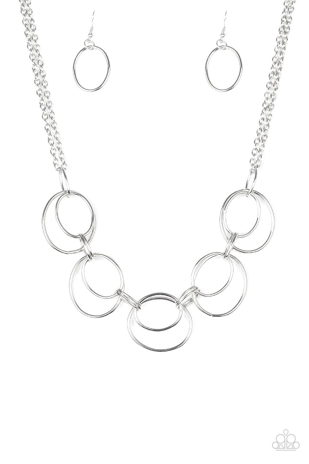 Doubled silver hoops link below the collar for a bold industrial look. Features an adjustable clasp closure.