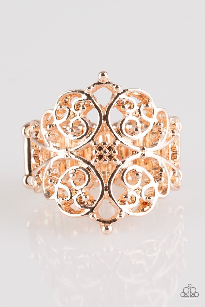 Brushed in a glistening finish, shimmery rose gold filigree vines across the finger, coalescing into an airy frame for a vintage-inspired look. Features a stretchy band for a flexible fit.