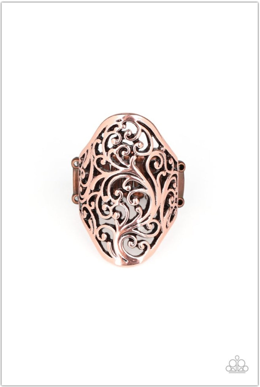 Brushed in an antiqued shimmer, copper vine-like filigree branches across the finger for an airy look. Features a stretchy band for a flexible fit.