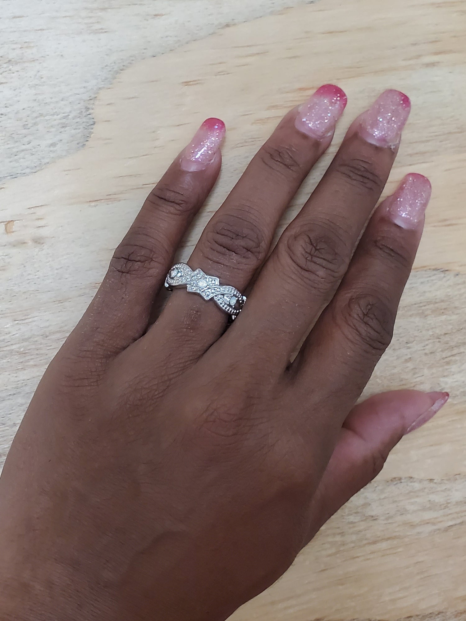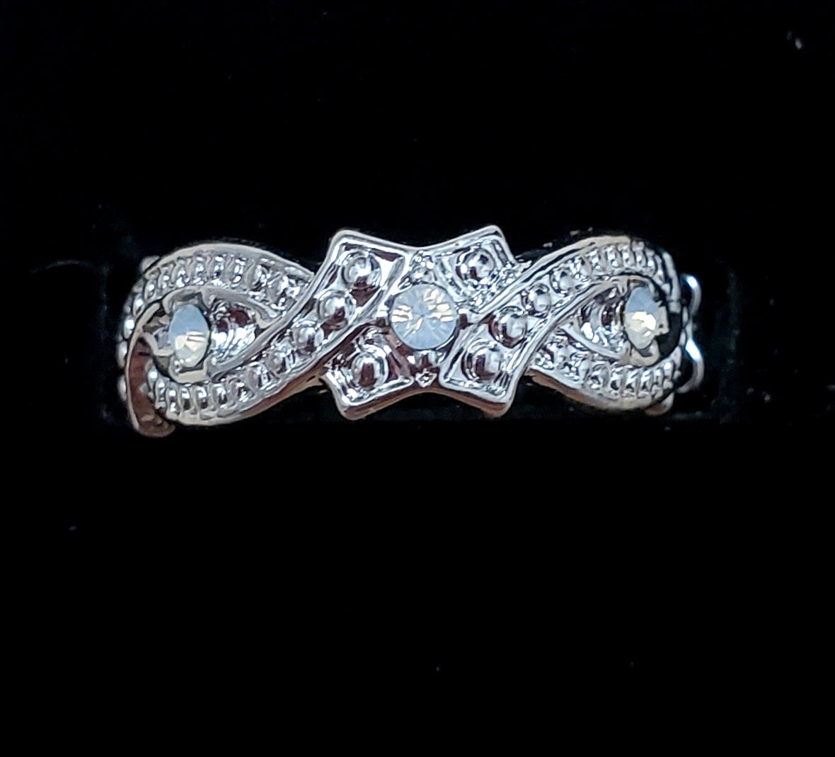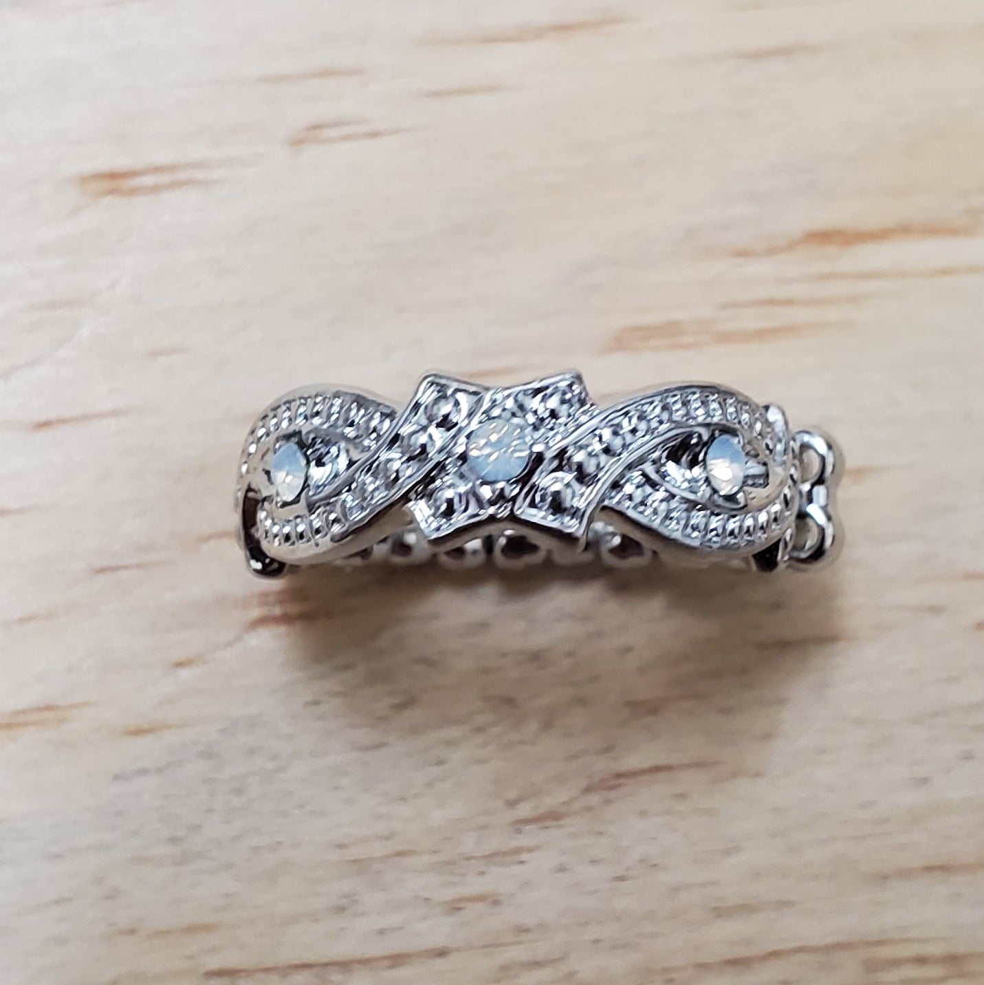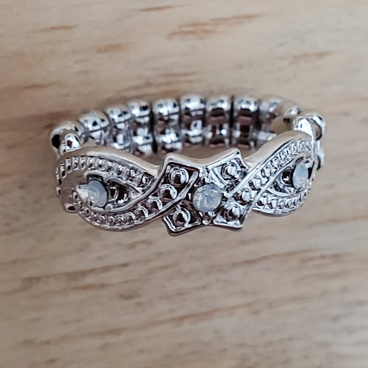 Beautiful silver tone ring with stretchy back.