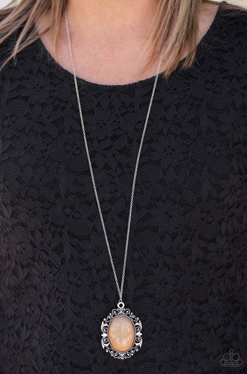 Featuring a faux rock finish, a shiny brown bead is pressed into the center of a frilly silver frame radiating with studded details. The dramatic pendant swings from the bottom of a lengthened silver chain for a vintage inspired look. Features an adjustable clasp closure.