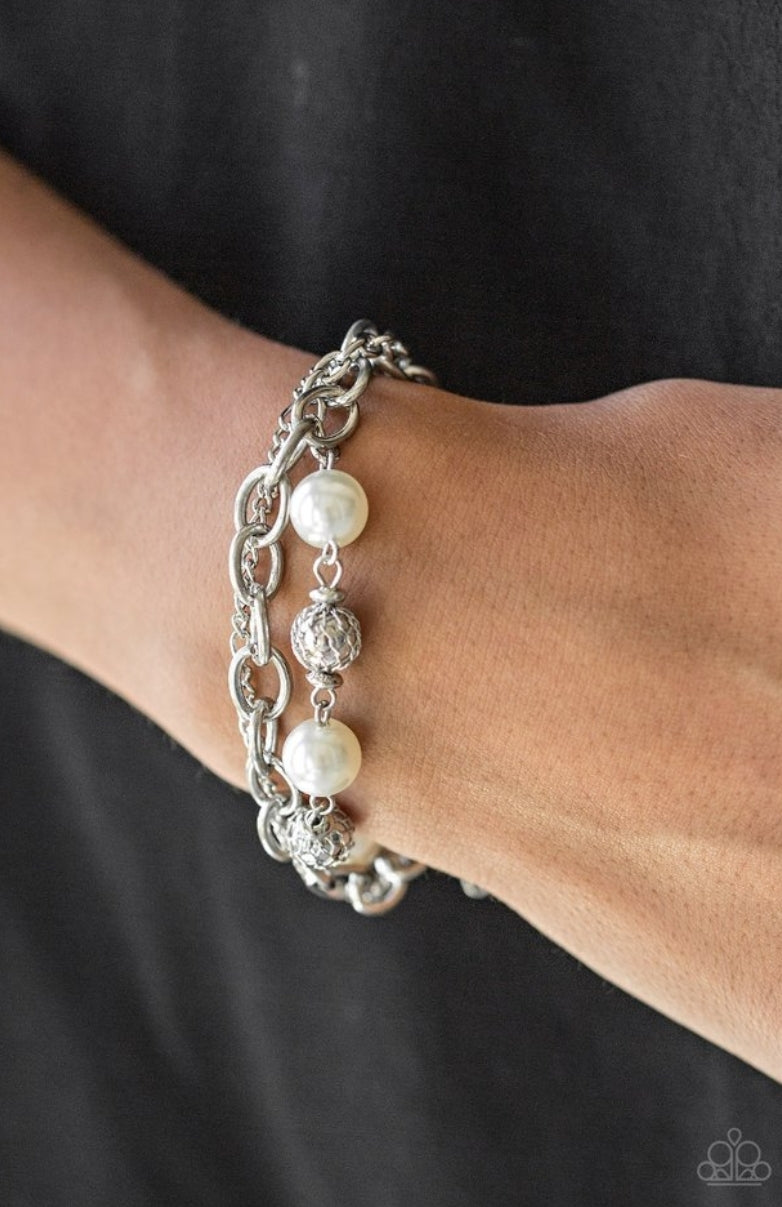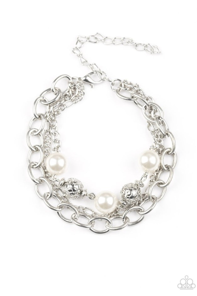 Wrapped in wire mesh, classic silver beads join pearly white beads along a shimmery silver chain. Varying in size and shimmer, mismatched silver chains join the beaded strand around the wrist for a refined finish. Features an adjustable clasp closure.