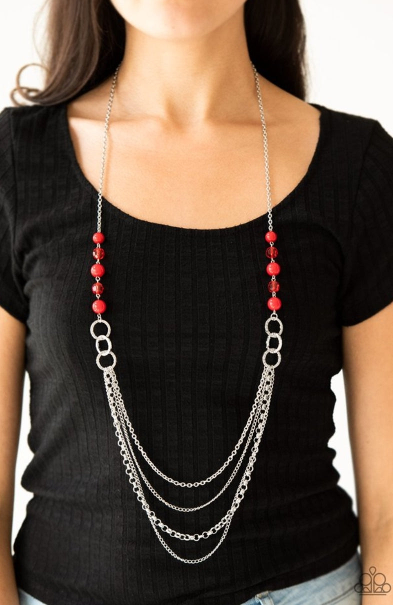Polished red, faceted crystal-like and delicately hammered silver hoops give way to mismatched silver chains down the chest for a whimsical look. Features an adjustable clasp closure.