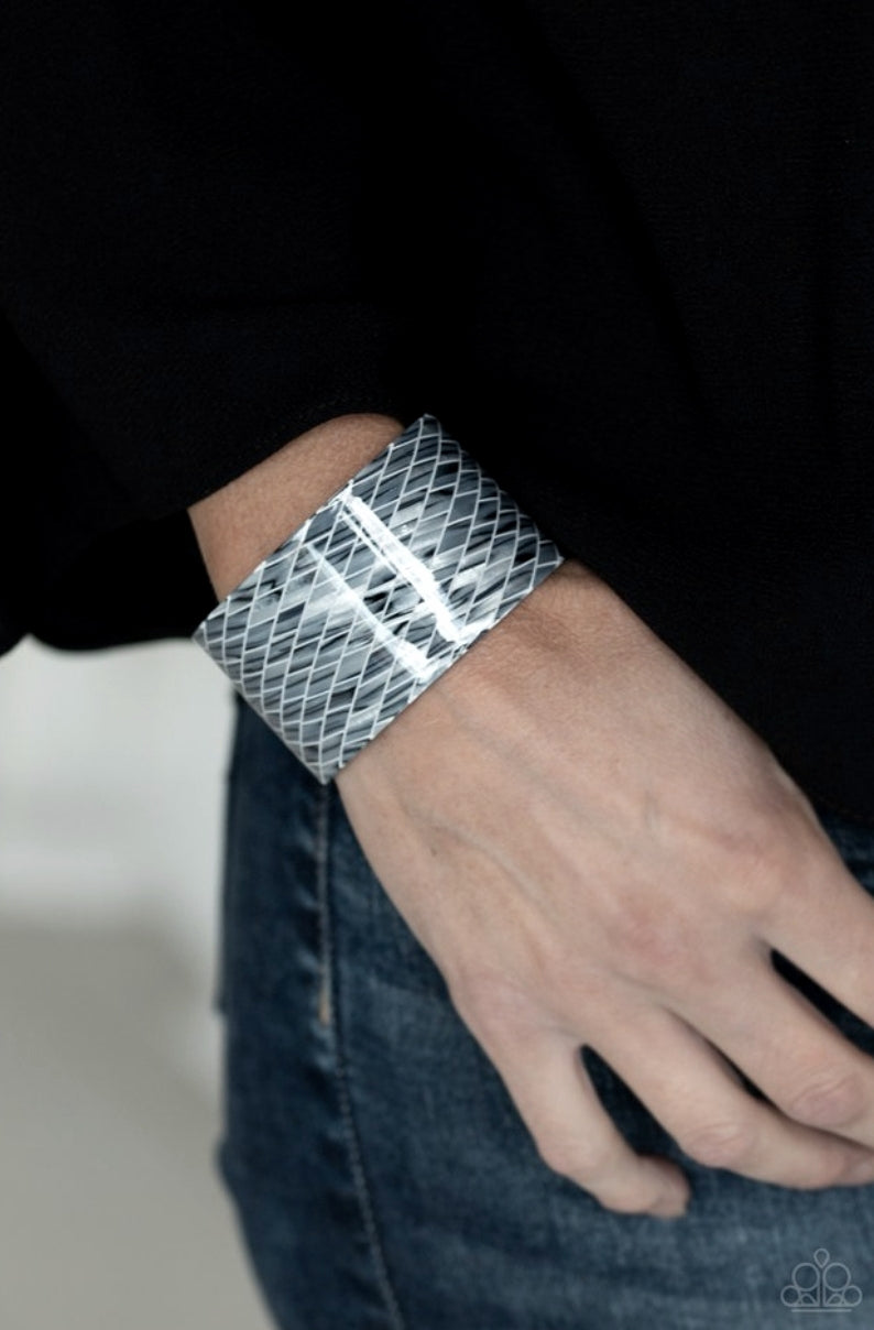 Featuring a metallic geometric print, a thick acrylic cuff wraps around the wrist for a retro inspired look. Color may vary.