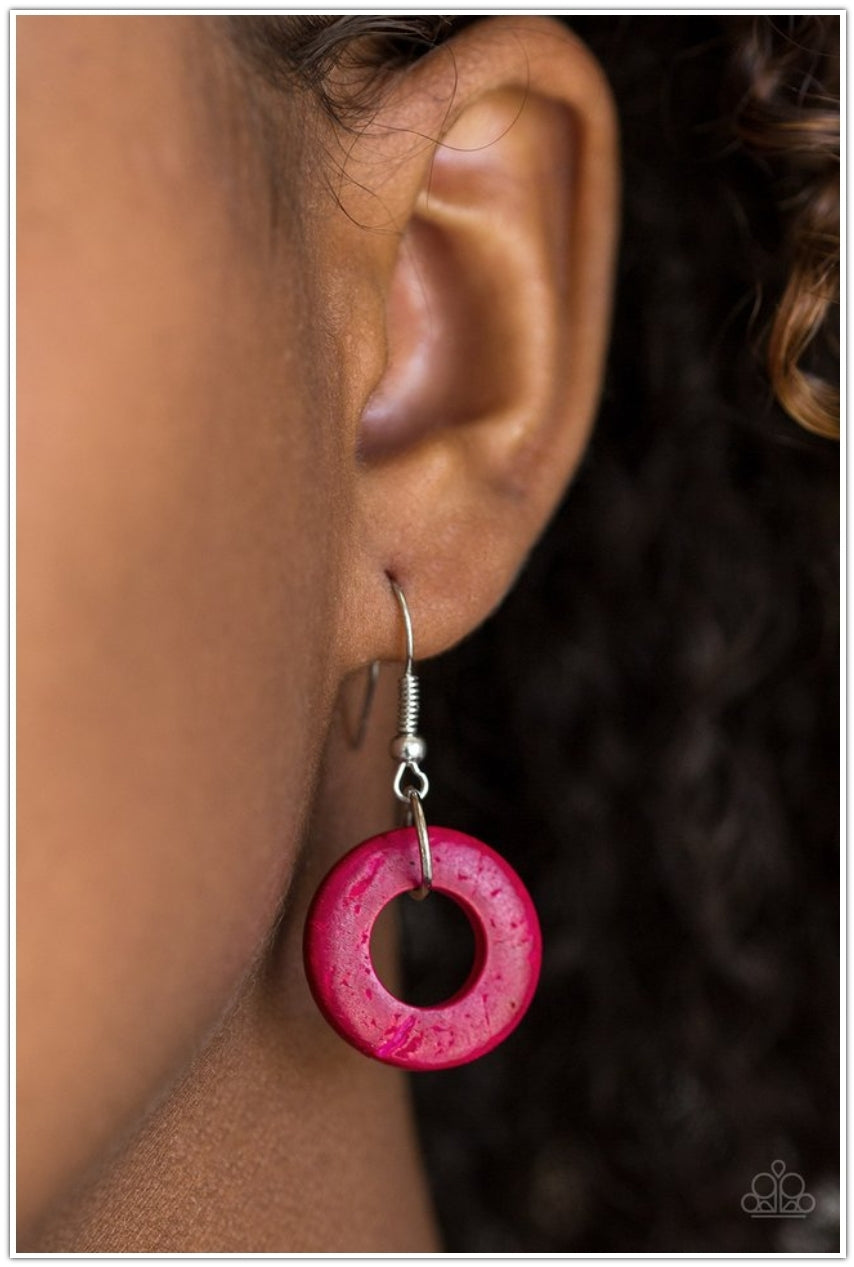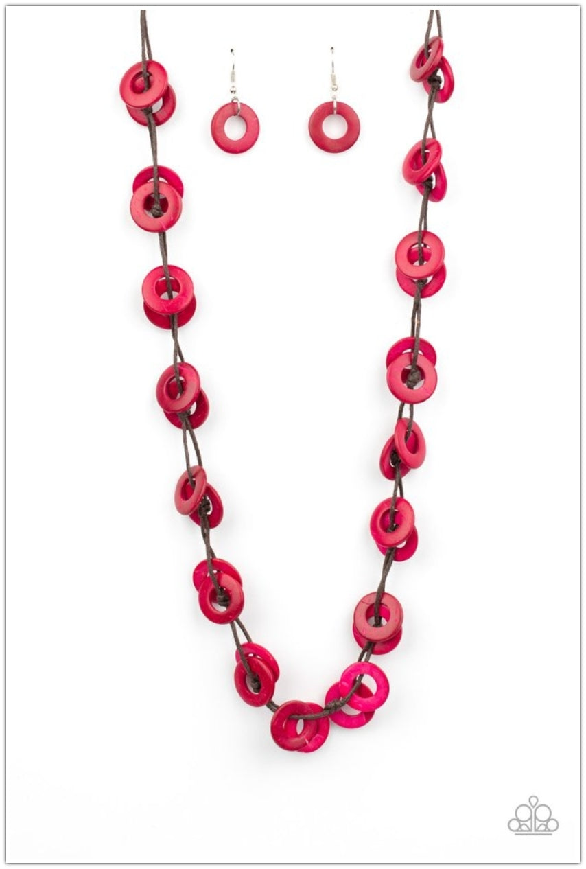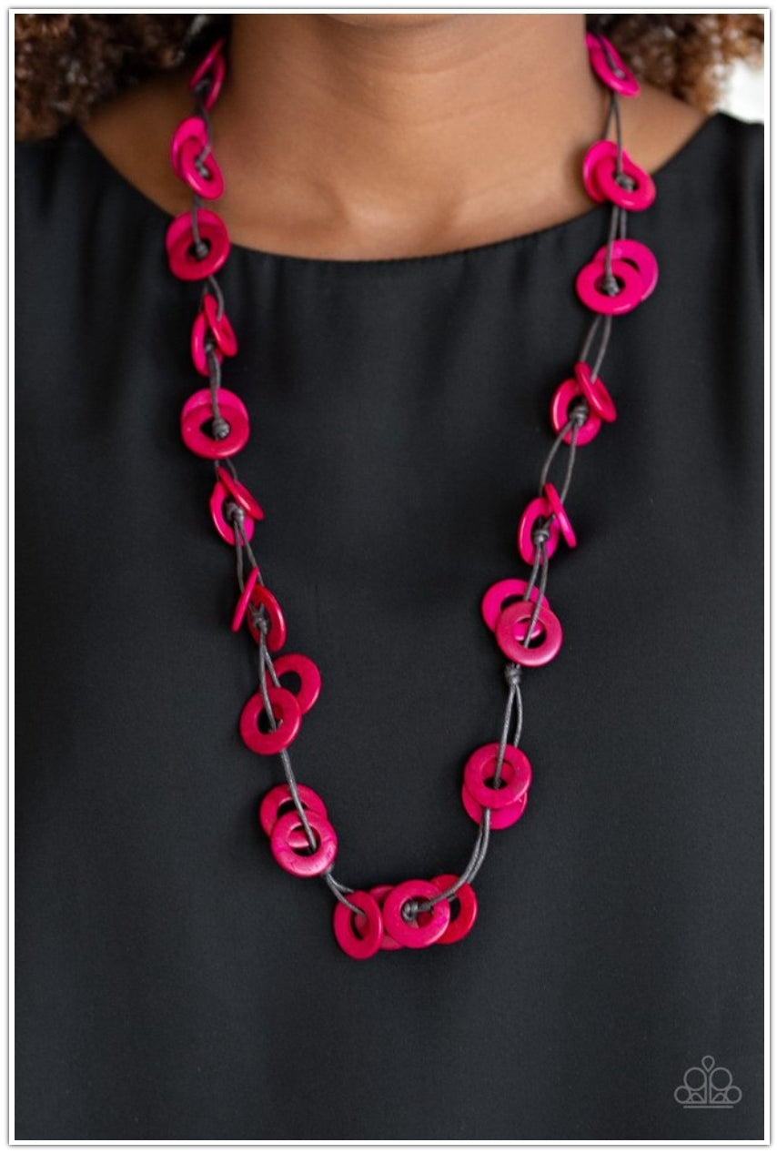 Shiny brown cording knots around vivacious pink wooden discs, creating a colorful display across the chest. Features a button loop closure.