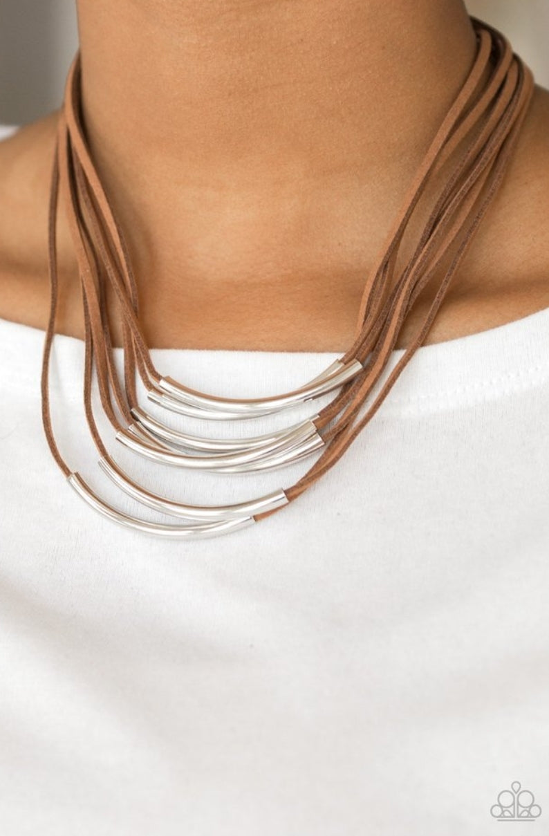Glistening silver rods slide along strips of brown suede, creating earthy layers below the collar. Features an adjustable clasp closure.