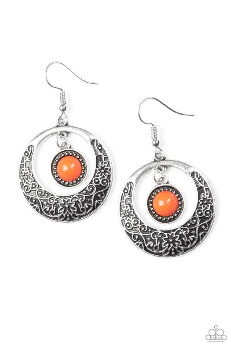 A vivacious orange bead swings from the top of a shimmery silver hoop featuring floral detail for a seasonal look. Earring attaches to a standard fishhook fitting.