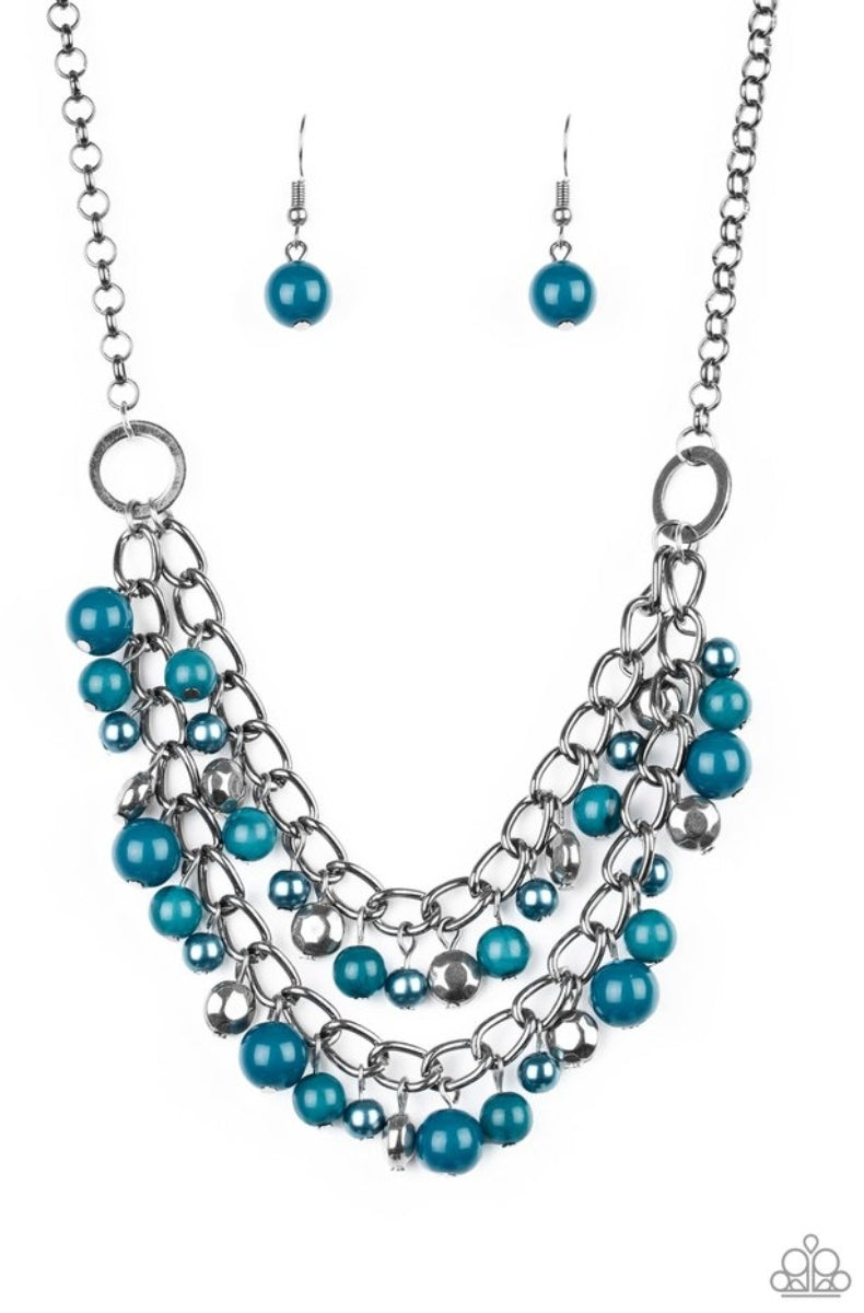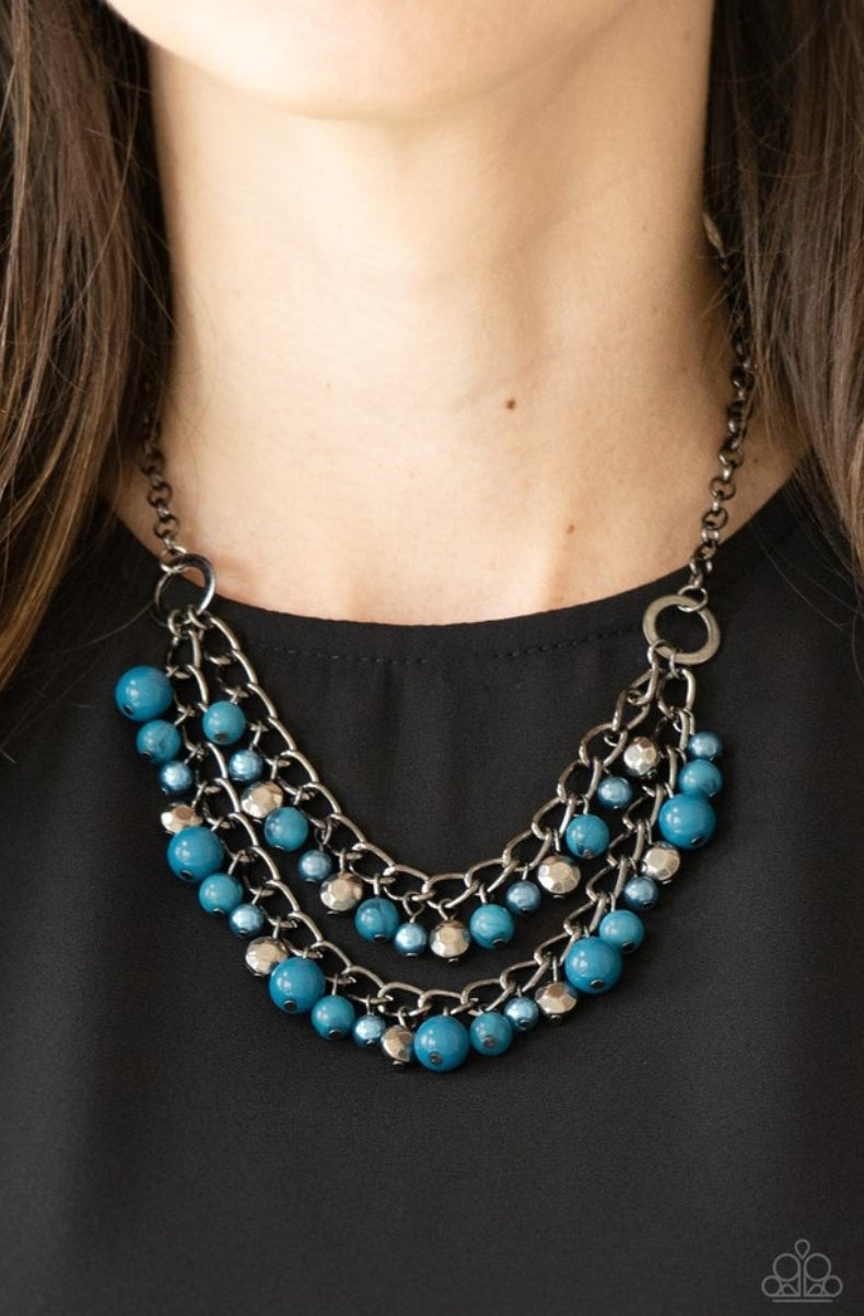 Pearly and polished blue beading joins faceted gunmetal beads along a bold gunmetal chain, creating a sassy fringe below the collar. Features an adjustable clasp closure.