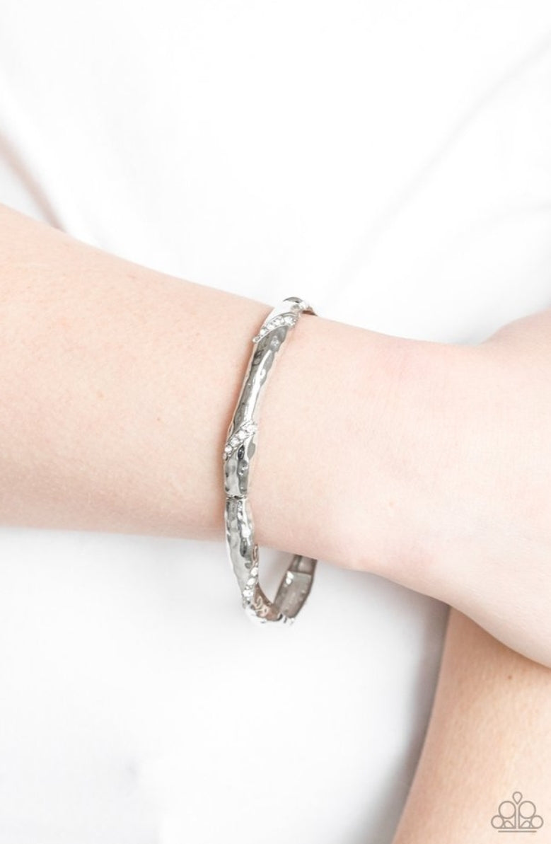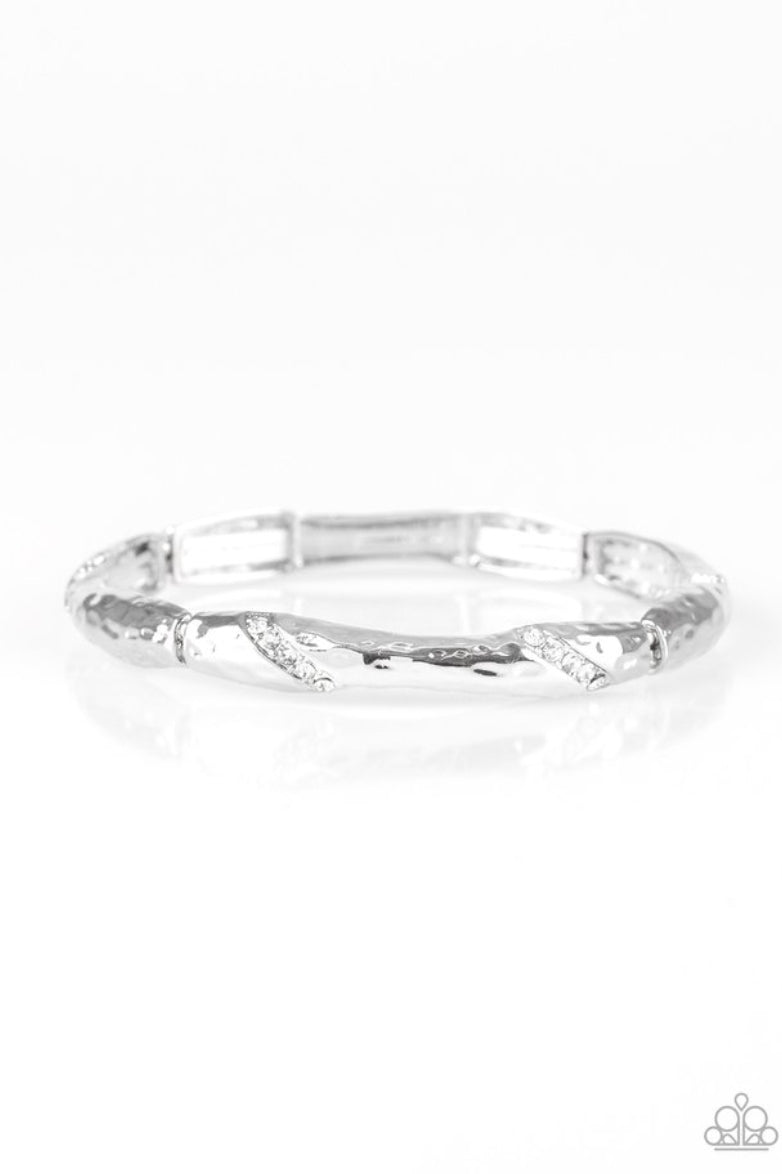 Encrusted in ribbons of glassy white rhinestones, hammered silver frames are threaded along a stretchy band around the wrist for a refined look.