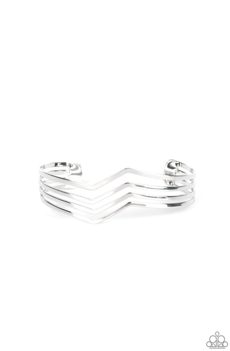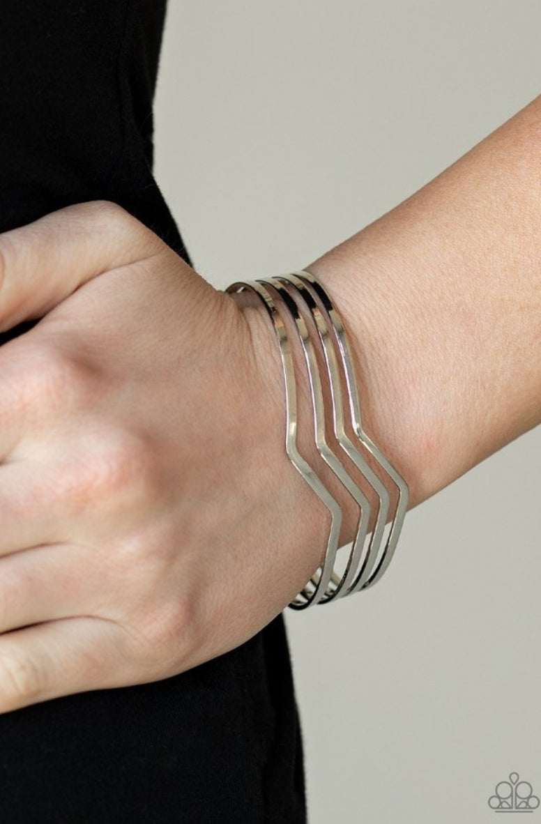 Glistening silver bars zigzag across the wrist, coalescing into a wavy cuff.