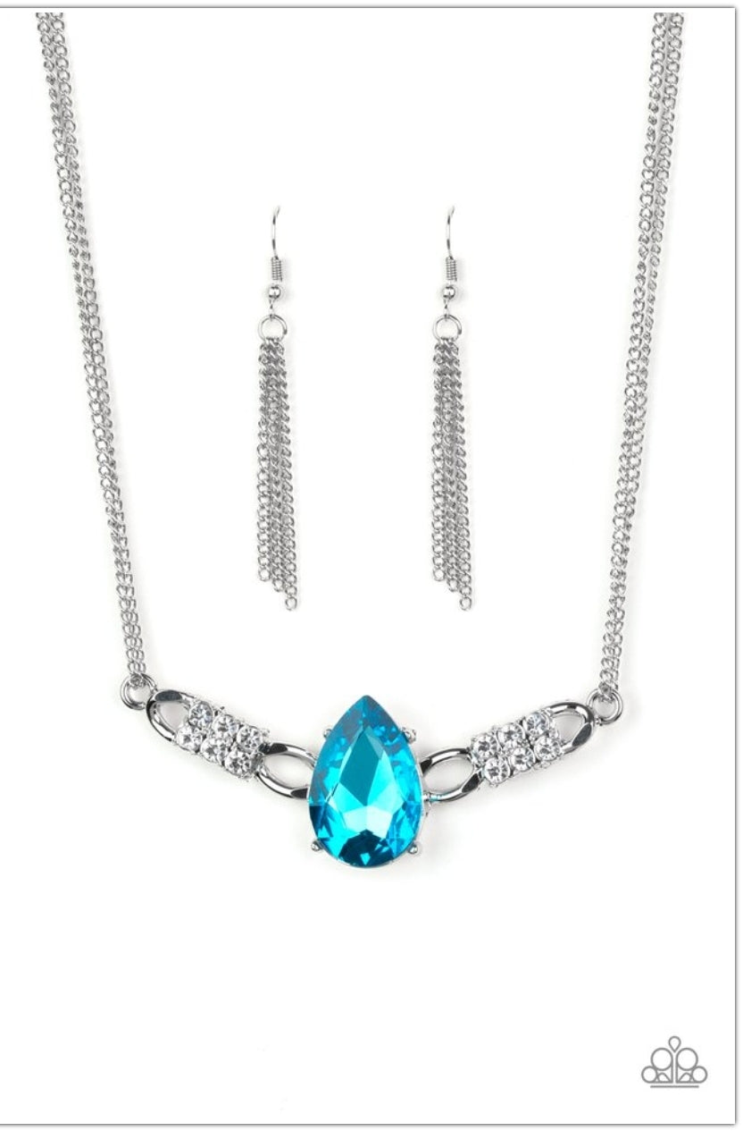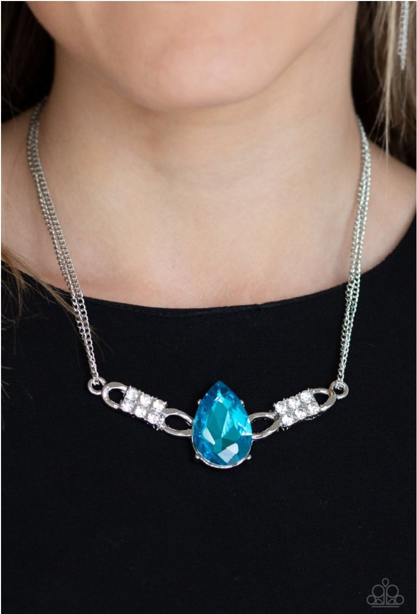 Cut into an alluring teardrop, an oversized blue rhinestone gem attaches to bold silver frames radiating with glassy white rhinestones. The dramatic pendant attaches to doubled silver chains, swinging horizontally below the collar in a glamorous fashion. Features an adjustable clasp closure.