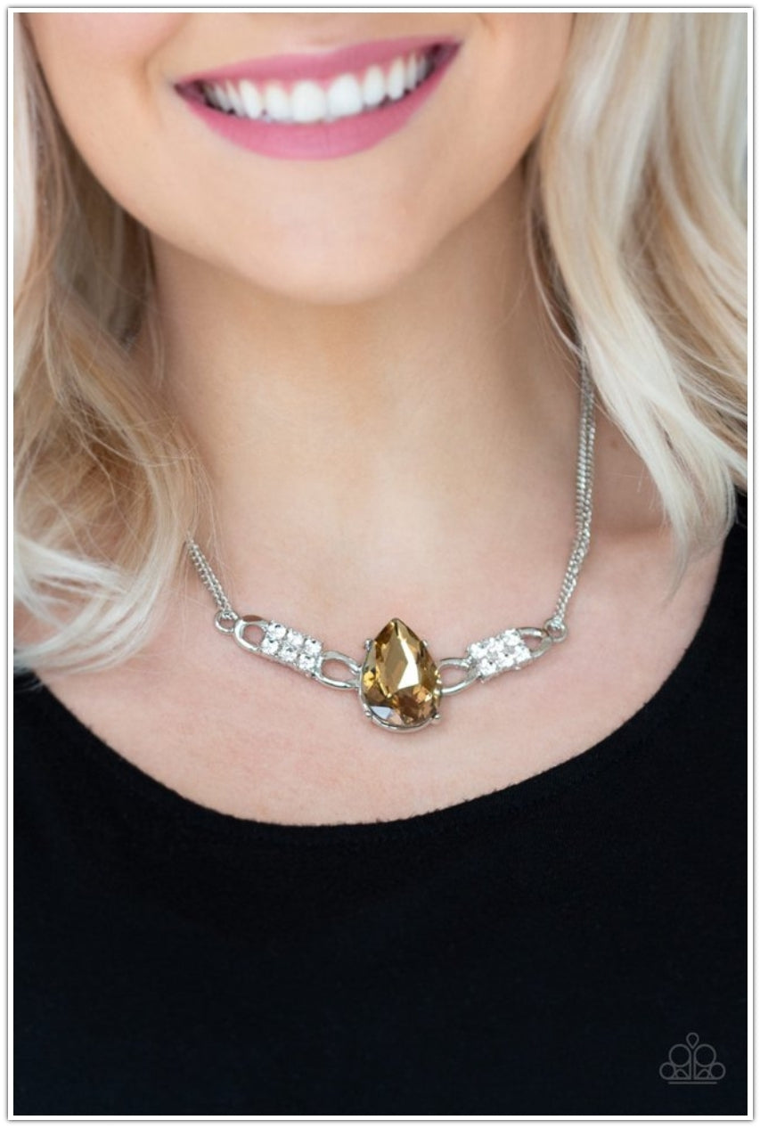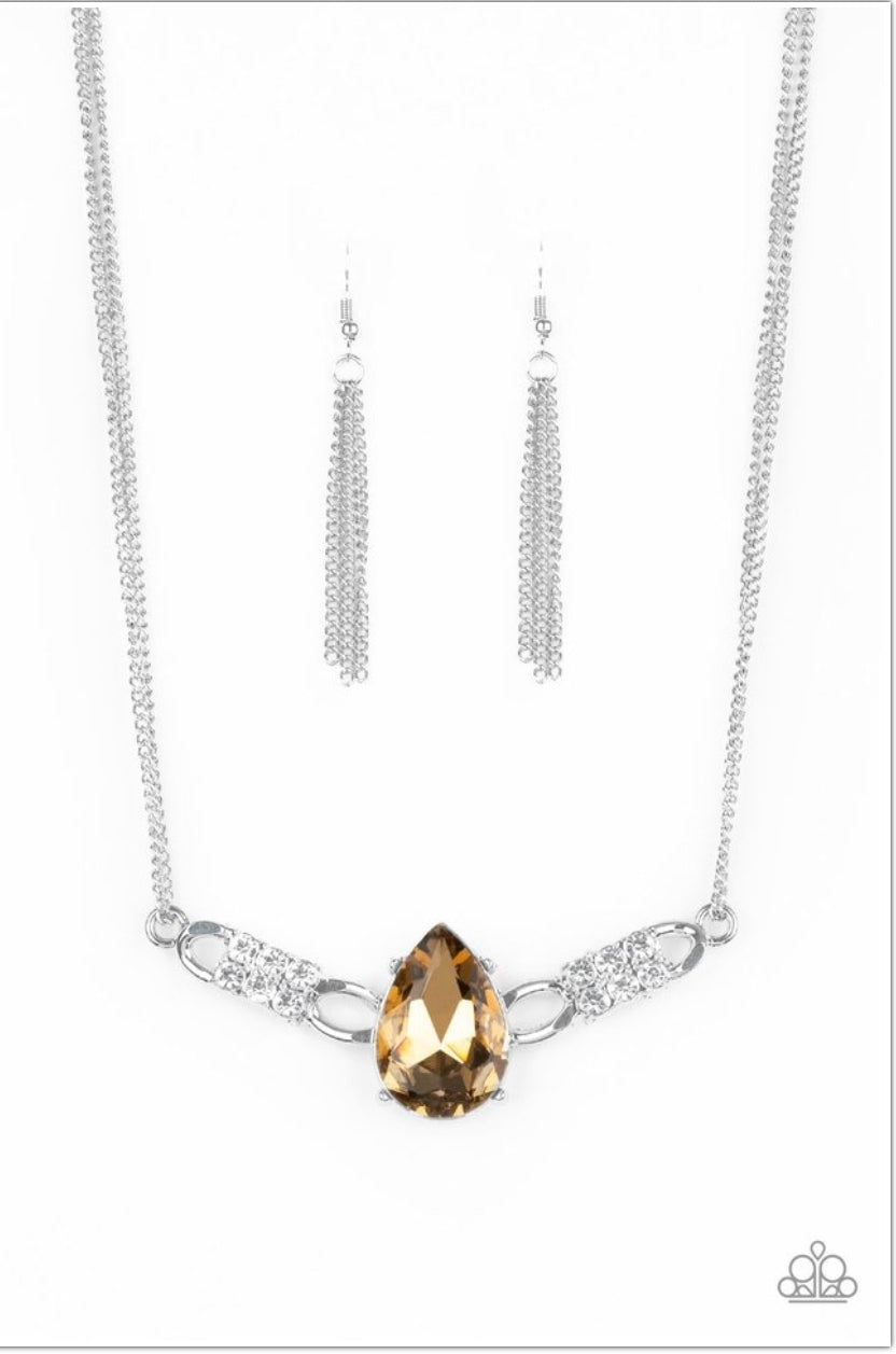 Cut into an alluring teardrop, an oversized topaz rhinestone gem attaches to bold silver frames radiating with glassy white rhinestones. The dramatic pendant attaches to doubled silver chains, swinging horizontally below the collar in a glamorous fashion. Features an adjustable clasp closure.