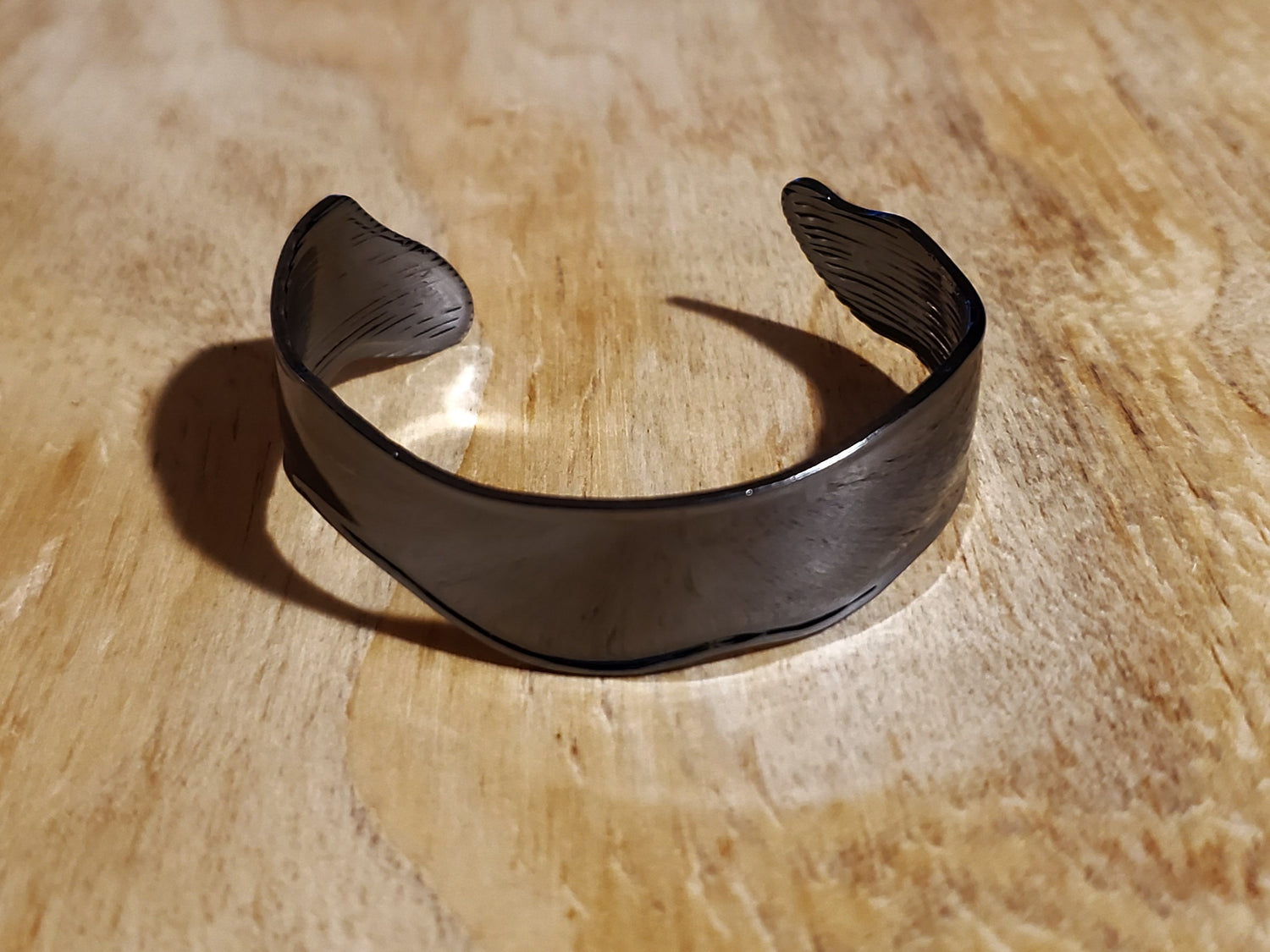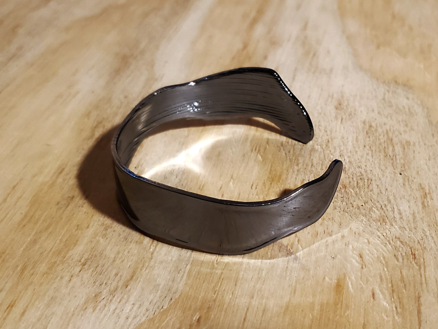 Shiny gunmetal cuff wraps around the wrist for an edgy look.