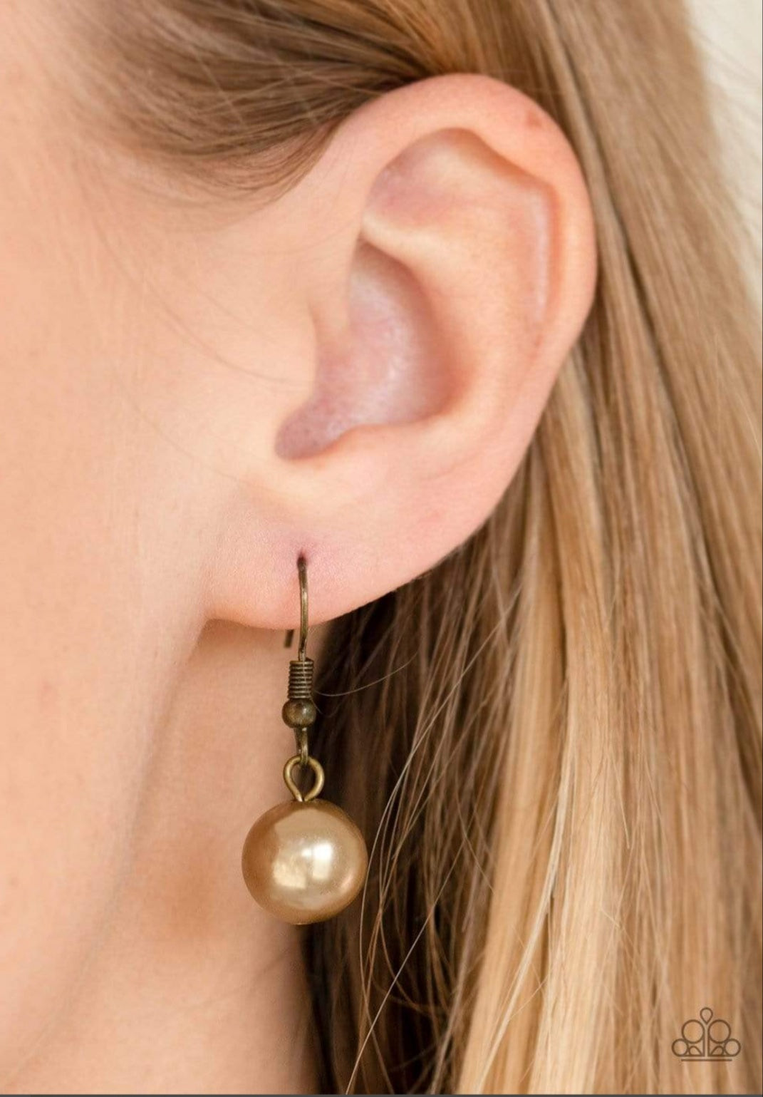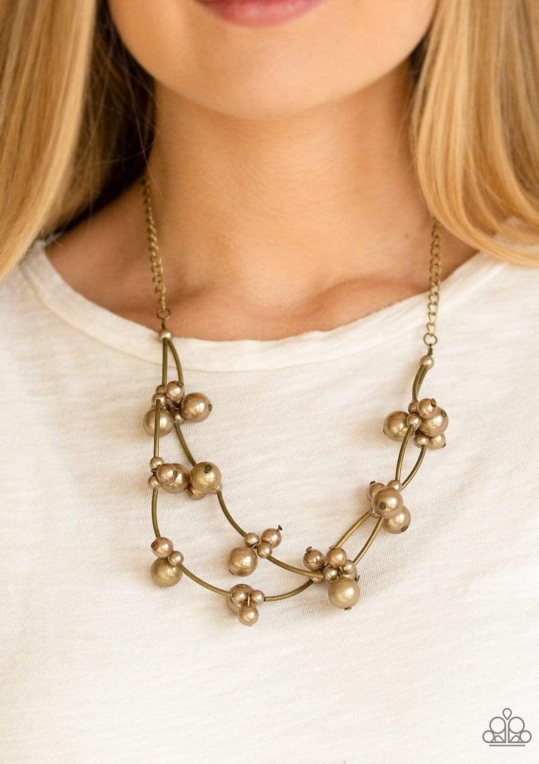 Cylindrical brass beads and clusters of pearly brass beads are threaded along invisible wires, creating bubbly layers below the collar for a refined look. Features an adjustable clasp closure.