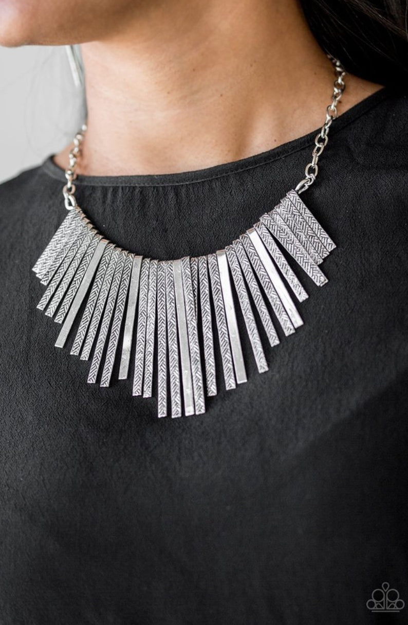 Embossed in edgy linear patterns, flat silver rods alternate with plain silver rods below the collar, creating a fiercely tapered fringe. Features an adjustable clasp closure.