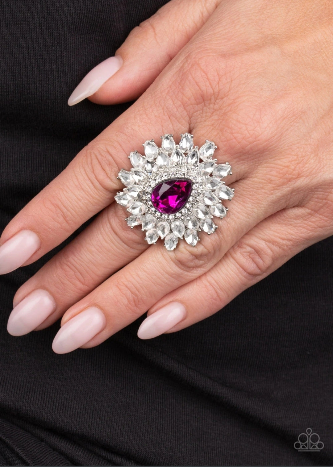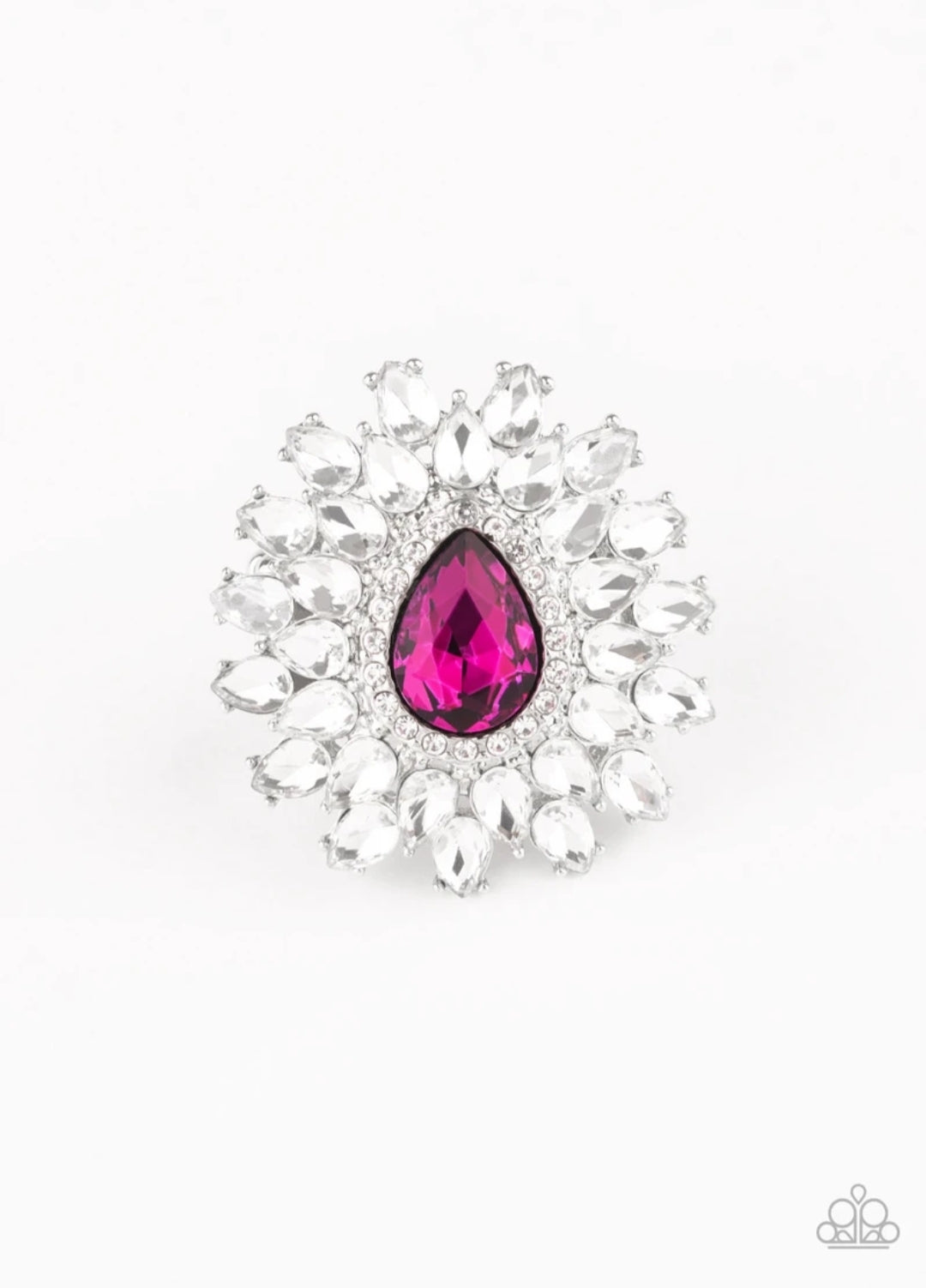 Dotted in dainty white rhinestones, silver petals radiate from a regal pink teardrop shaped rhinestone center for an edgy look. Features a stretchy band for a flexible fit.