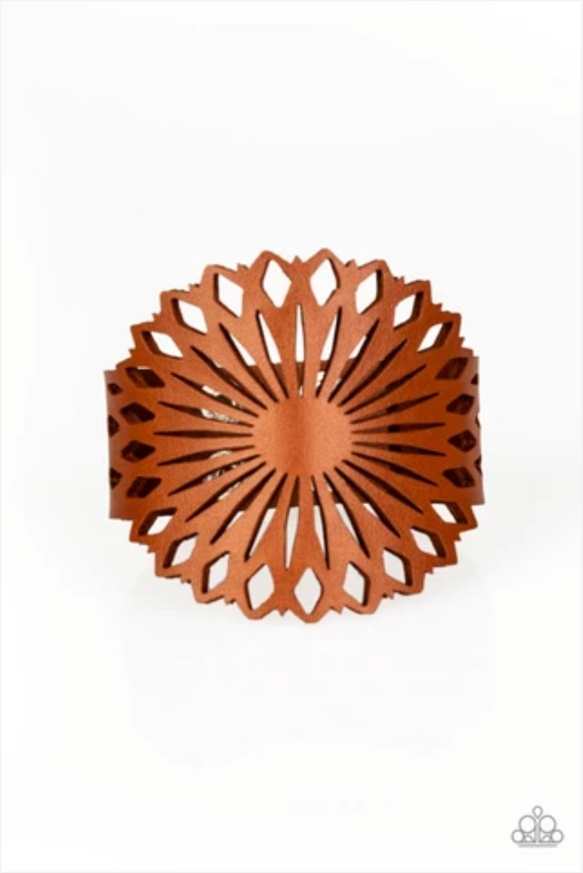 A thick strip of brown leather has been cut into a blooming wildflower across the center of the wrist for a seasonal flair. Features an adjustable snap closure.