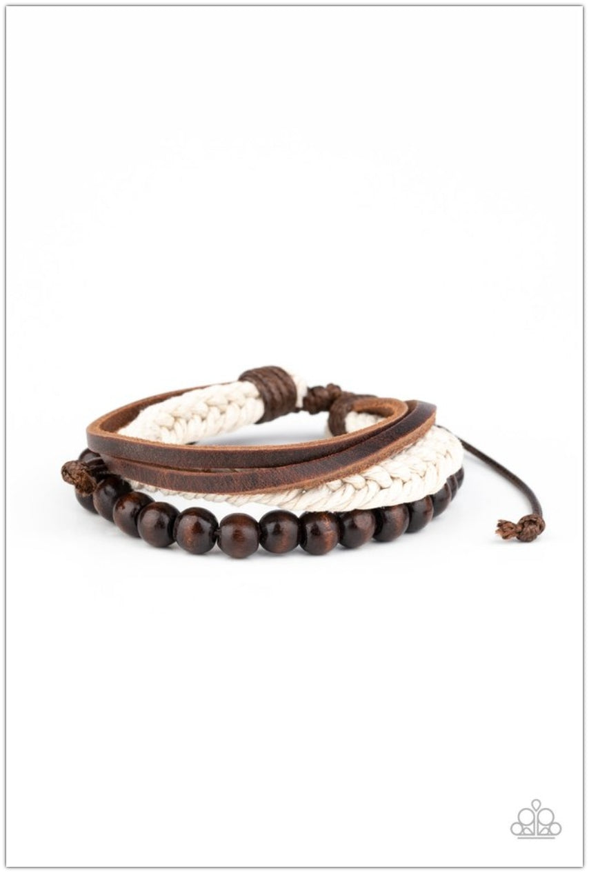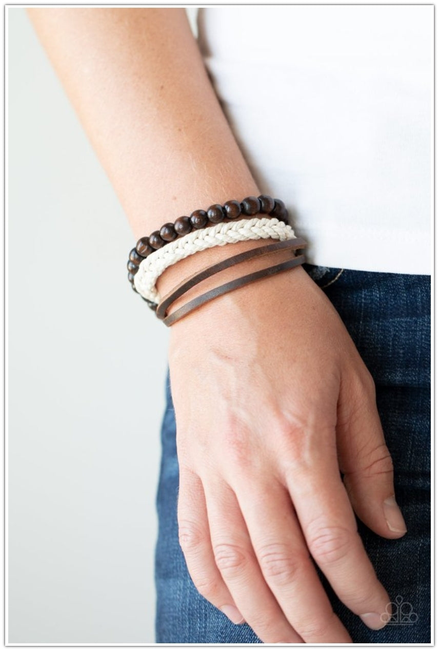 Mismatched strands of wooden beads, leather bands, and braided twine layer across the wrist for an earthy look. Features an adjustable sliding knot closure.