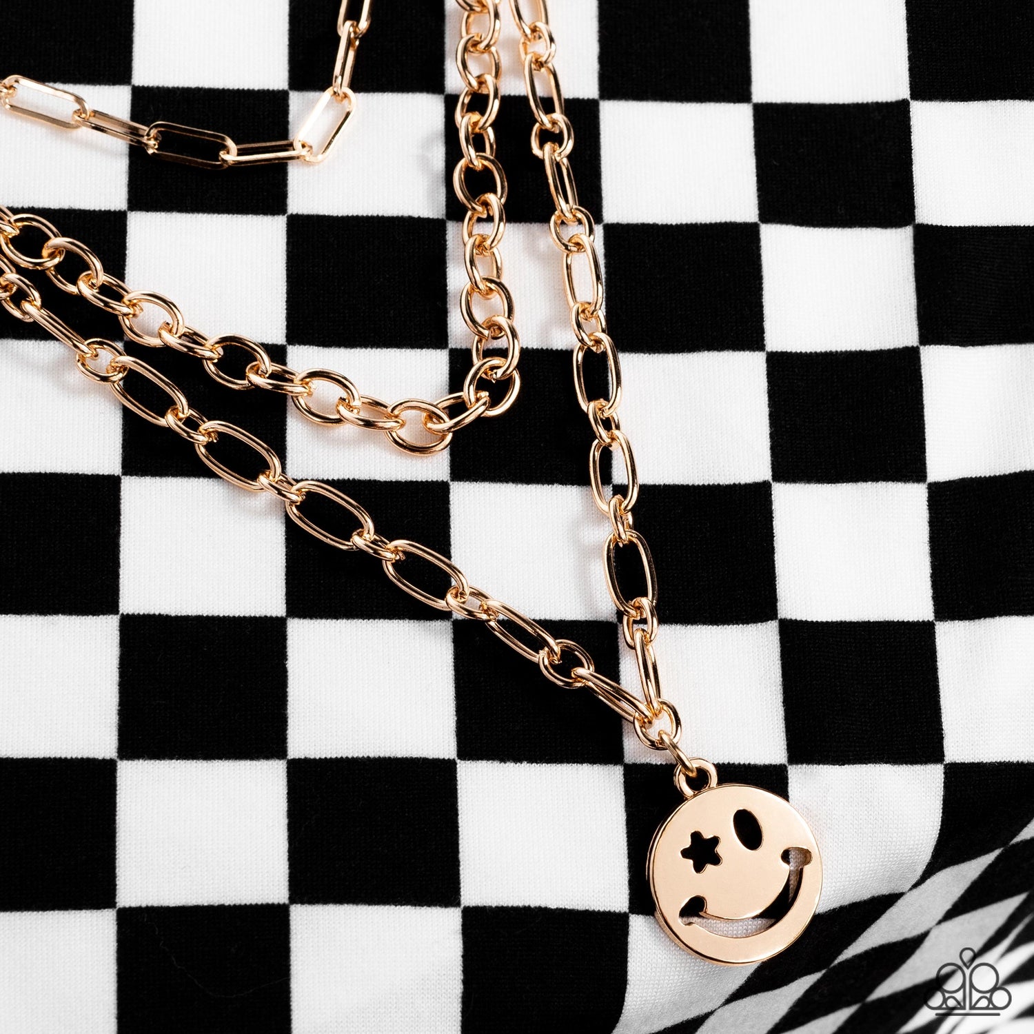 A trio of gold paperclip, classic, and oval link chains coalesces down the neckline for a monochromatic masterpiece. Strung on the lowermost oval link chain, a gold smiley face pendant, with a star mimicking a wink for one of its eyes, stands out and reflects light in every direction for a statement finish. Features an adjustable clasp closure.