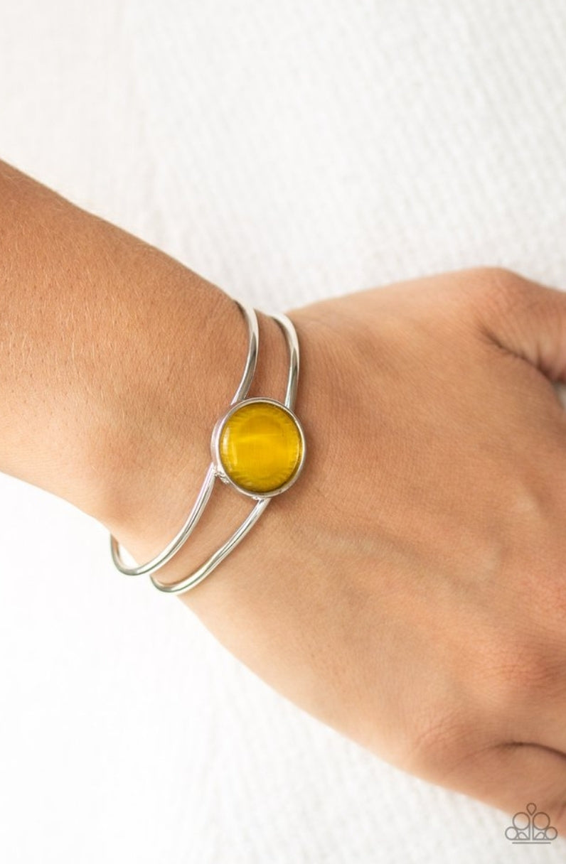 A glowing yellow cat's eye centerpiece sits atop an airy silver cuff-like bangle for a refined finish. Features a hinged closure.