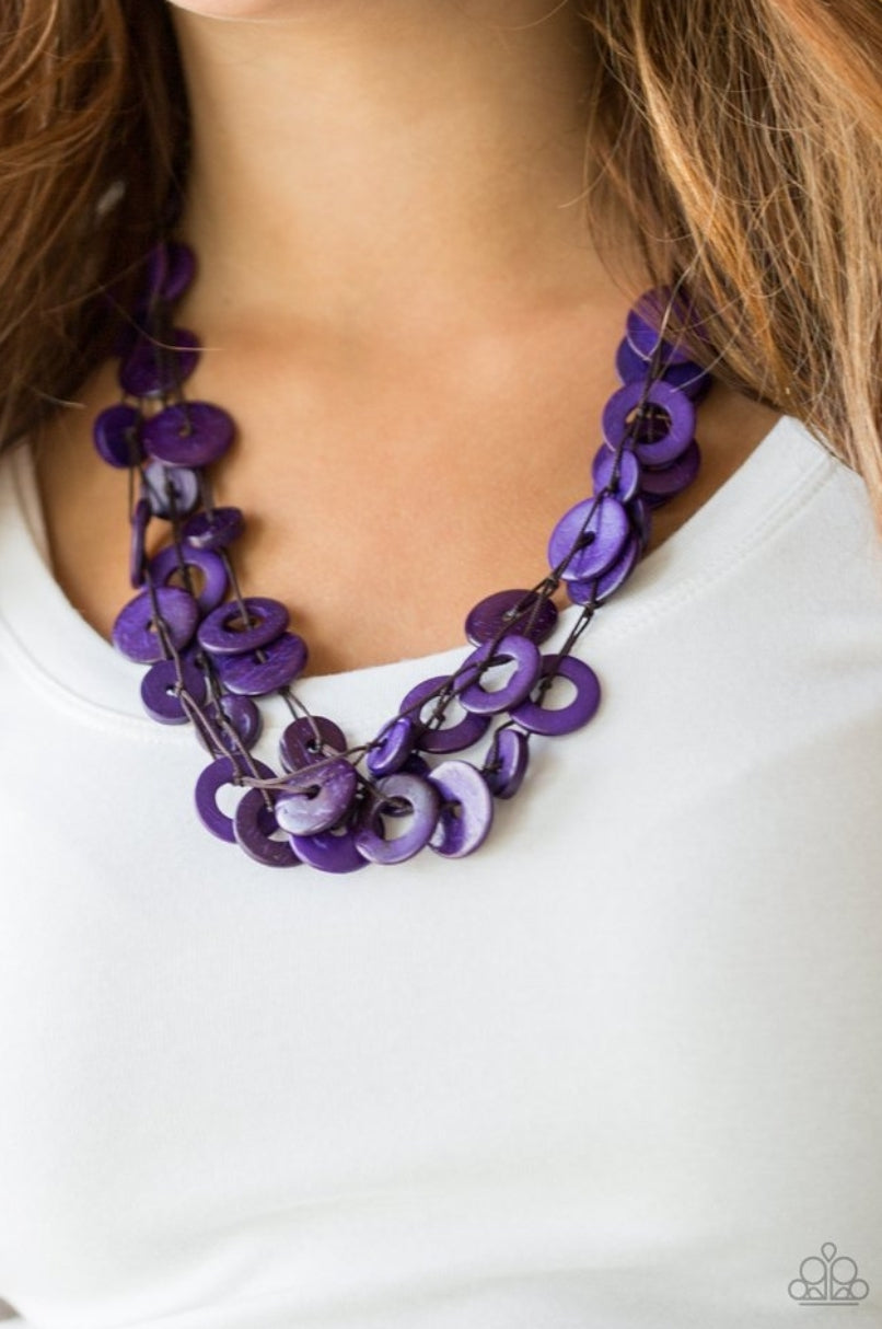 Shiny brown cording knots around mismatched purple wooden beads, creating vivacious layers. Features a button loop closure.