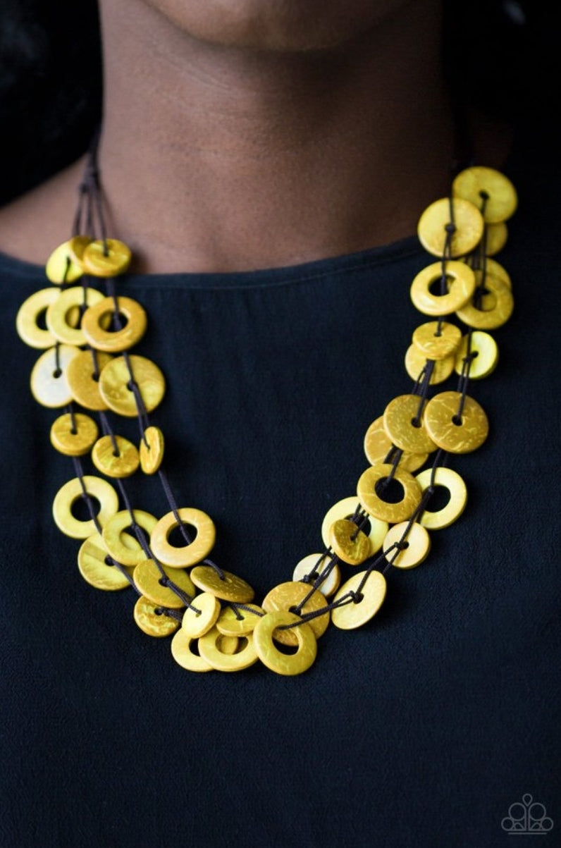 Shiny brown cording knots around mismatched yellow wooden beads, creating vivacious layers. Features a button loop closure.