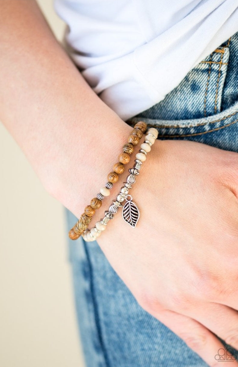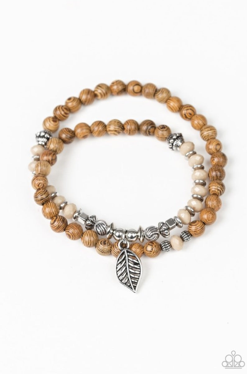 A collection of earthy wooden beads, dainty silver accents, and faceted brown beads are threaded along a lengthened stretchy band. Infused with a silver leaf charm, the stretchy band double-wraps around the wrist for a layered look.