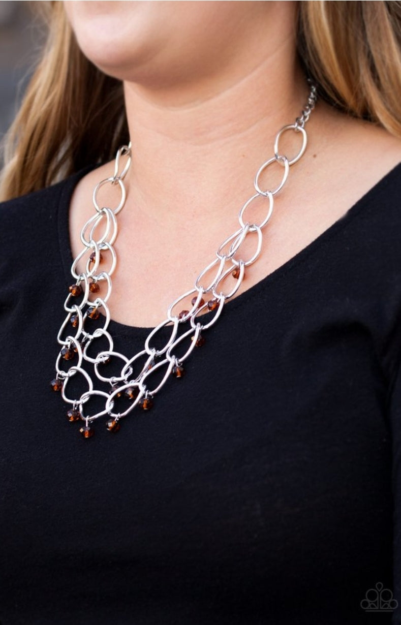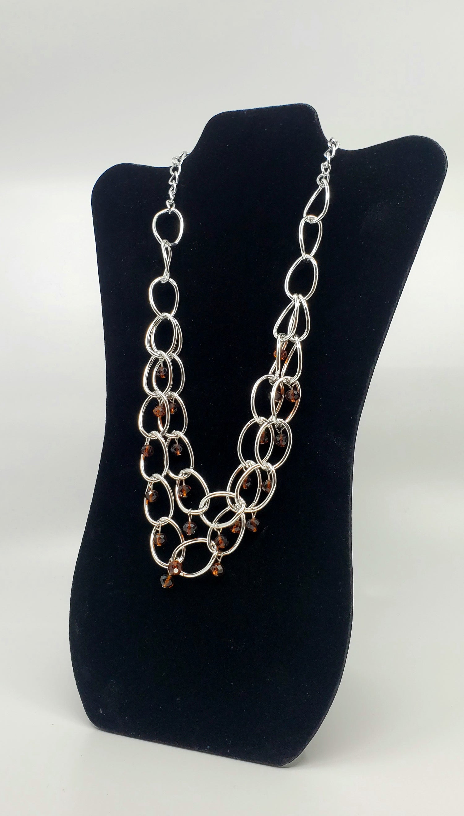 Shimmery brown crystal-like beads swing from two layers of oversized silver links below the collar for a refined look. Features an adjustable clasp closure.