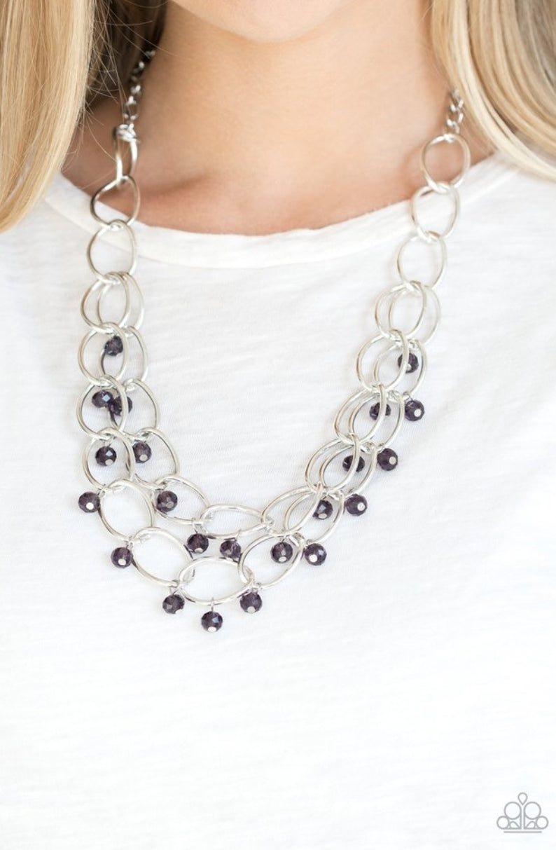 Metallic purple crystal-like beads swing from two layers of oversized silver links below the collar for a refined look. Features an adjustable clasp closure.