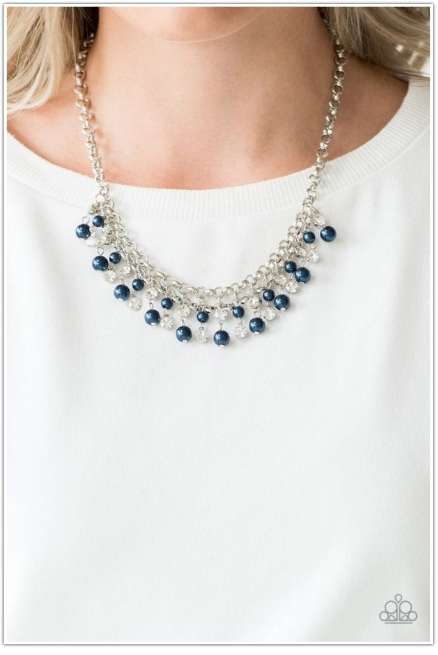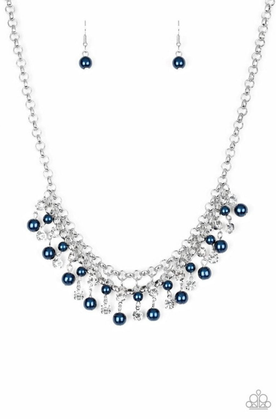 Glittery white rhinestones and classic blue pearls swing from the bottom of interlocking silver chains, creating a bubbly fringe below the collar. Features an adjustable clasp closure.